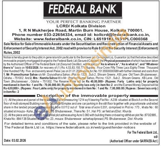 Description of the immovable property : 1) All the piece and parcel of the residential Flat admeasuring 1214 sq ft bearing Flat No: A206 situated at Block A on the Second floor of multi storeyed Building namely Gopinath complex and one car parking in the stiltfloor together with proportionate undivided share in the landed property admeasuring Acre 0.0112 out of Total area of acre 0.351, comprised in Plot no:173, khata No: 60 situated at mouza-Kuha, Tahsil: Jatni, PS :Bhubaneswar, Thana No: 51, Hal PS: airfield and Dist: Khurda