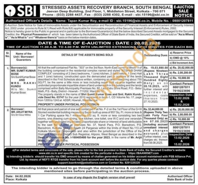 All that piece and parcel of one self-contained Flat No. F-2 on the 1st Floor of the G+III Storied residential building measuring Super built up area of 857 Sq. Ft. more or less & 1 Car Parking space No.1 measuring 120 sq. ft. more or less consisting two bed rooms, one drawing cum dining, one kitchen, one toilet, one W.C and one verandah together with undivided impartiable proportionate share or interest of land attributable to the said flat situated at premises No. 37. Nandi Para, P.O. Bansdroni, PS. Bansdroni, Kolkata, District- South 24 Parganas within the limits of Ward No. 113 of Kolkata Municipal Corporation and also within the jurisdiction of the Office of the District & Additional District Sub Registrar, Alipore, West Bengal as described in the Deed of Coveyance No. 1-160405480 for the year 2023, in the name of Mr. Arijit Mitra, Sio Sri Gour Mitra