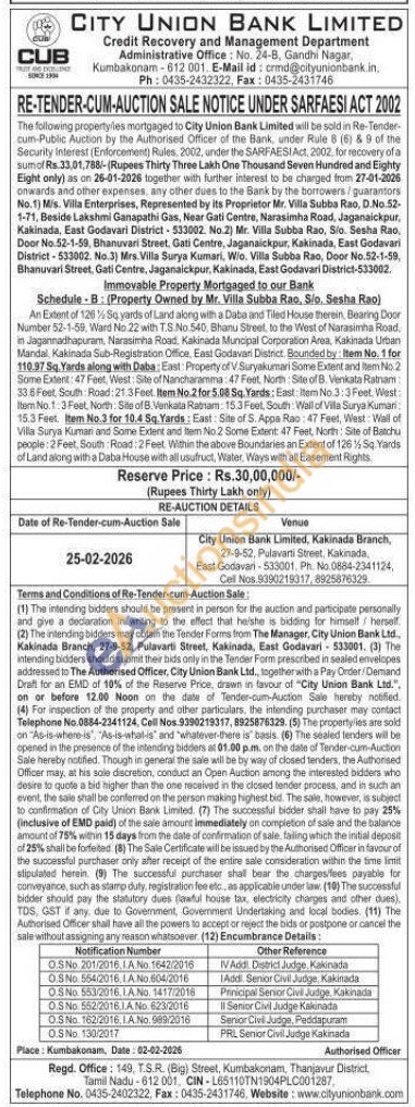 Immovable Property Mortgaged to our Bank Schedule-B: (Property Owned by Mr. Villa Subba Rao, S/o. Sesha Rao): An Extent of 126 1/2 Sq yards of Land along with a Daba and Tiled House therein, Bearing Door Number 52-1-59, Ward No.22 with T.S.No.540, Bhanu Street, to the West of Narasimha Road, in Jagannadhapuram, Narasimha Road, Kakinada Muncipal Corporation Area, Kakinada Urban Mandal, Kakinada Sub-Registration Office, East Godavan District Bounded by: Item No. 1 for 110.97 Sq. Yards along with Daba: East: Property of V Suryakumari Some Extent and Item No.2 Some Extent: 47 Feet, West: Site of Nancharamma: 47 Feet, North: Site of B. Venkata Ratnam: 33.6 Feet, South: Road: 21.3 Feet. Item No.2 for 5.08 Sq. Yards: East: Item No.3:3 Feet, West: Item No.1:3 Feet, North: Site of B.Venkata Ratnam: 15.3 Feet, South: Wall of Villa Surya Kumari: 15.3 Feet. Item No.3 for 10.4 Sq. Yards: East: Site of S. Appa Rao: 47 Feet, West: Wall of Villa Surya Kumari and Some Extent and Item No. 2 Some Extent: 47 Feet, North: Site of Batchu people: 2 Feet, South Road: 2 Feet. Within the above Boundaries an Extent of 126 % Sq. Yards of Land along with a Daba House with all usufruct, Water, Ways with all Easement Rights