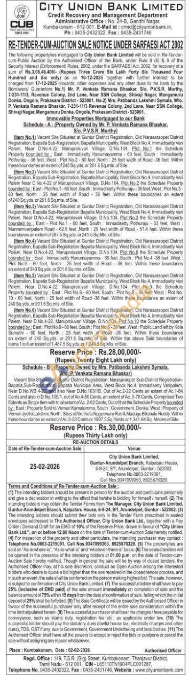 Schedule-A: (Property Owned by Mr. P. Venkata Ramana Bhaskar, Sio. P.V.S.R. Murthy): (Item No.1) Vacant Site Situated at Guntur District Registration, Old Narasaraopet District Registration, Bapatla Sub-Registration, Bapatla Municipality, West Block No.4, Immadisetty Vari Palem, Near D.No.4-22, Maruproluvari Village. D.No.104. Plot No.1 the Schedule Property bounded by East Immadisetty Hanumayamma 60 feet, South: Immadisetty Pothuraju 36 feet West: Plot No.2-60 feet North: 25 feet width of Road -36 feet Within these boundaries an extent of 240 Sq.yds. or 201.6 Sq.mts. of Site.