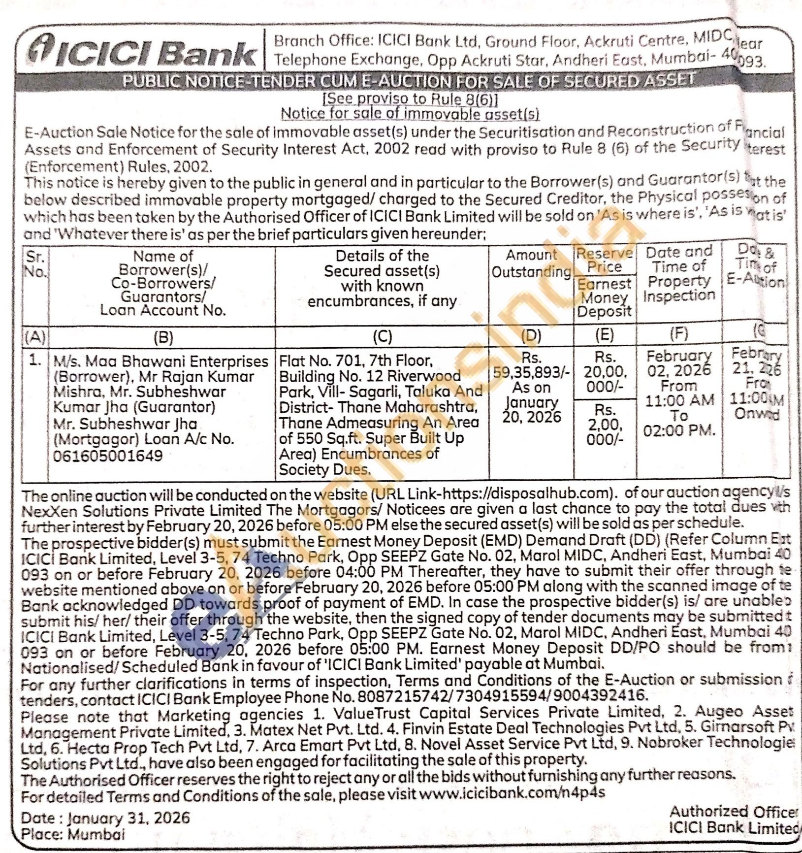 Flat No. 701, 7th Floor, Building No. 12 Riverwood Park, Vill- Sagarli, Taluka And District- Thane Maharashtra, Thane Admeasuring An Area of 550 Sq.ft. Super Area) Encumbrances of Society Dues. Sq.ft. Super Built Up