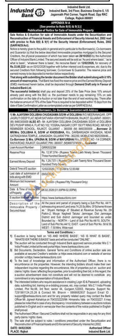 All the piece and parcel of property being a Sub Plot No. 44/11, admeasuring around Land area 74.25 Sq Mitrs. Of Scheme Known as Shyam Heritage -8 Situated at Revenue Survey No. 29/Paikin-2, Mouje: Naghedi Taluka: Jamnagar, Dist Jamnagar, District and Sub district Jamnagar and bounded as under Bounded by:-NORTH-Land of Sub Plot No.44/10, SOUTH-Land of Sub Plot No 44/12, EAST Land of Sub Plot No. 58 & 59, WEST-7.50 Mtrs. Wide road