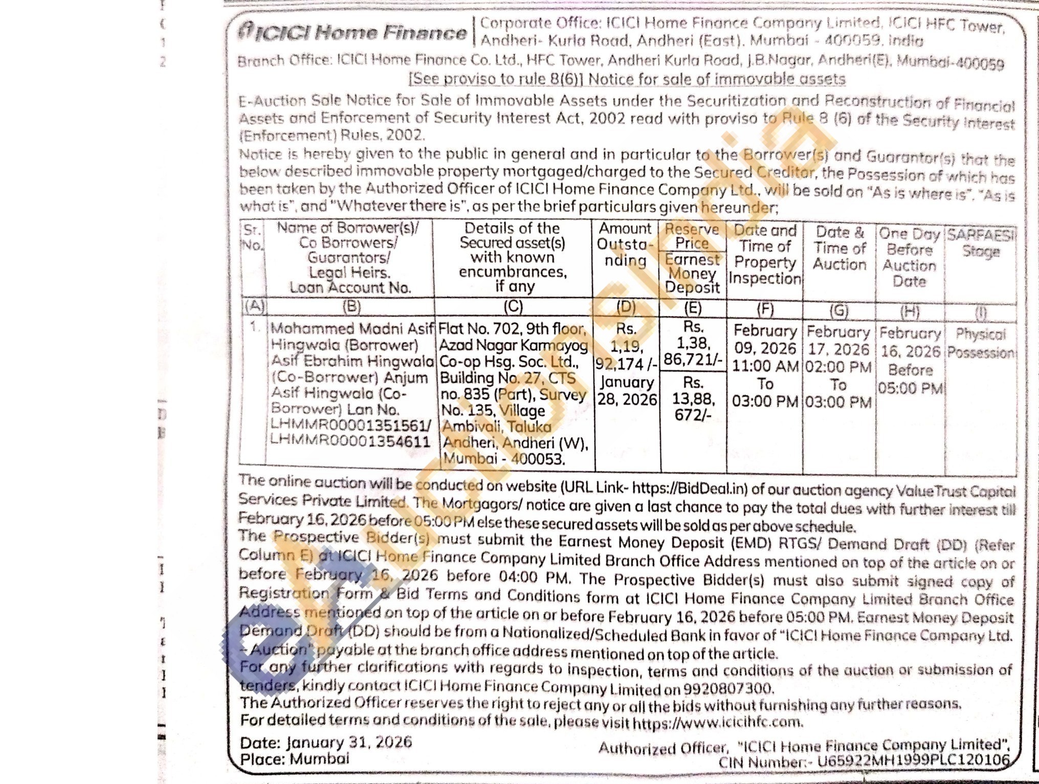 Flat No. 702, 9th floor, Azad Nagar Karmayog Co-op Hsg. Soc. Ltd., Building No. 27, CTS no. 835 (Part), Survey No. 135, Village Ambivali, Taluka Andheri, Andheri (W). Mumbai-400053.
