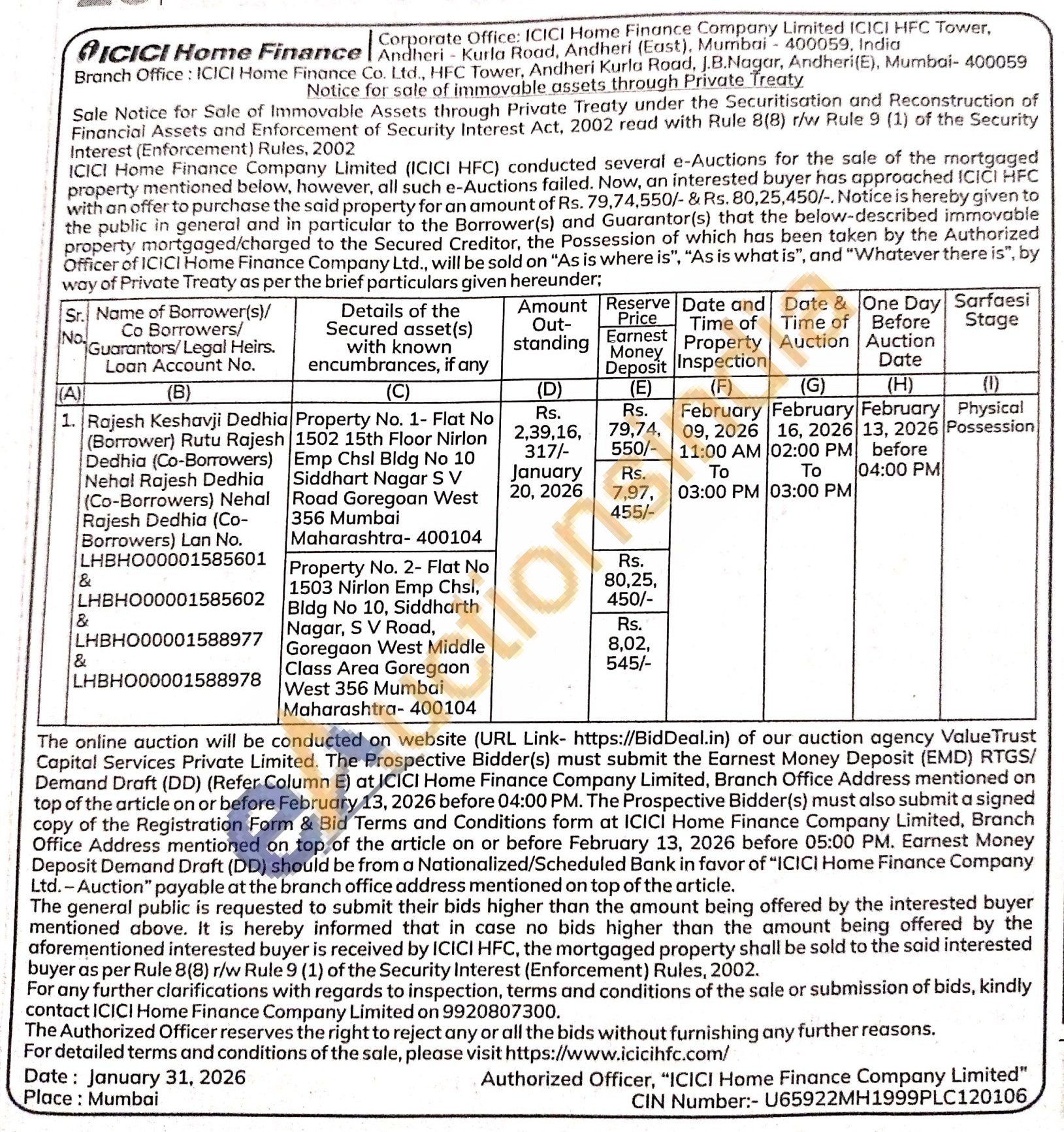 Property No. 2- Flat No 1503 Nirlon Emp Chsl, Bldg No 10, Siddharth Nagar, SV Road, Goregaon West Middle Class Area Goregaon West 356 Mumbai Maharashtra-400104
