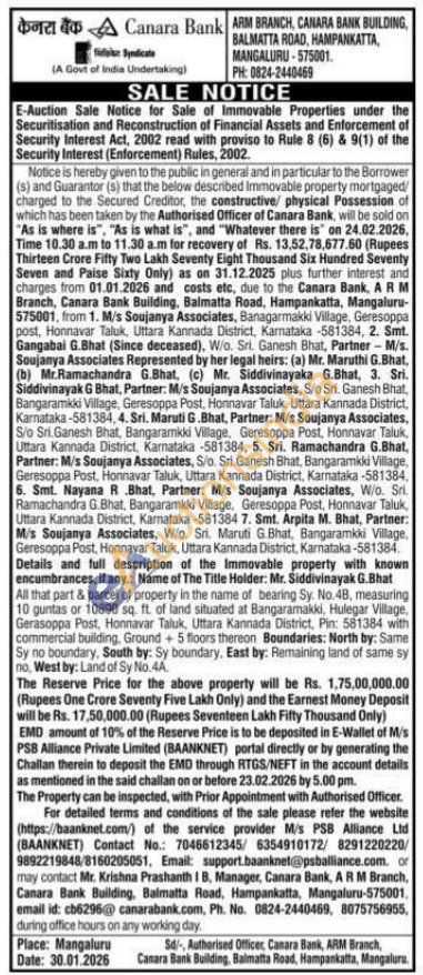 Details and full description of the Immovable property with known encumbrances, if any.: Name of The Title Holder: Mr. Siddivinayak G.Bhat All that part & parcel of property in the name of bearing Sy. No. 4B, measuring 10 guntas or 10890 sq. ft. of land situated at Bangaramakki, Hulegar Village, Gerasoppa Post, Honnavar Taluk, Uttara Kannada District, Pin: 581384 with commercial building, Ground + 5 floors thereon Boundaries: North by: Same Sy no boundary, South by: Sy boundary, East by: Remaining land of same sy no, West by: Land of Sy No.4A