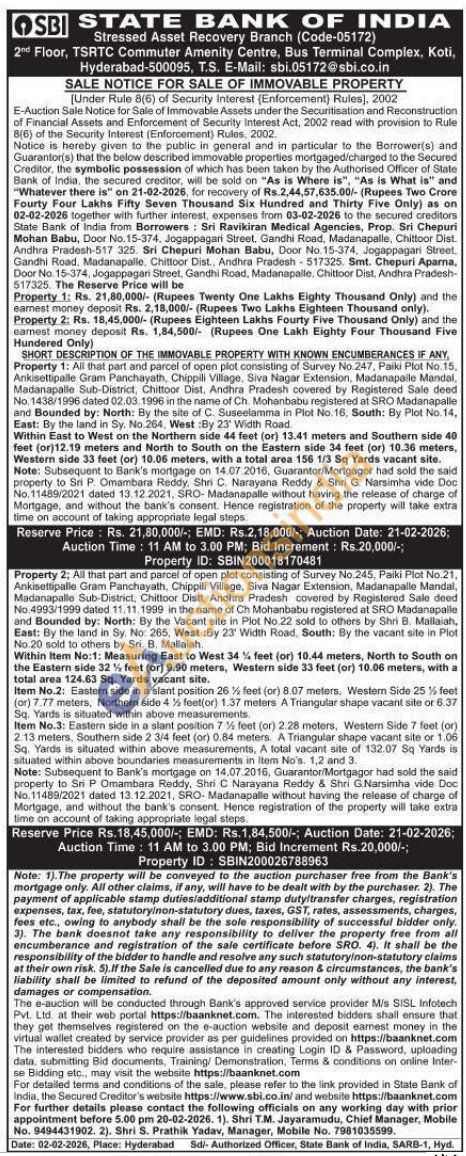 Property 2: All that part and parcel of open plot consisting of Survey No.245, Paiki Plot No.21. Ankisettipalle Gram Panchayath, Chippili Village, Siva Nagar Extension, Madanapalle Mandal, Madanapalle Sub-District, Chittoor Distt, Andhra Pradesh covered by Registered Sale deed No. 4993/1999 dated 11.11.1999 in the name of Ch Mohanbabu registered at SRO Madanapalle and Bounded by: North: By the Vacant site in Plot No.22 sold to others by Shri B. Mallaiah, East: By the land in Sy. No: 265, West :By 23' Width Road, South: By the vacant site in Plot No.20 sold to others by Sri. B. Mallaiah, Within Item No:1: Measuring East to West 34% feet (or) 10.44 meters, North to South on the Eastern side 32% feet (or) 9.90 meters, Western side 33 feet (or) 10.06 meters, with a total area 124.63 Sq. Yards vacant site. Item No.2: Eastern side in a slant position 26% feet (or) 8.07 meters. Western Side 25% feet (or) 7.77 meters, Northern side 4% feet(or) 1.37 meters A Triangular shape vacant site or 6.37 Sq. Yards is situated within above measurements. Item No.3: Eastern side in a slant position 7% feet (or) 2.28 meters, Western Side 7 feet (or) 2.13 meters, Southern side 2 3/4 feet (or) 0.84 meters. A Triangular shape vacant site or 1.06 Sq. Yards is situated within above measurements, A total vacant site of 132.07 Sq Yards is situated within above boundaries measurements in Item No's. 1,2 and 3. Note: Subsequent to Bank's mortgage on 14.07.2016, Guarantor/Mortgagor had sold the said property to Sri P Omambara Reddy, Shri C Narayana Reddy & Shri G.Narsimha vide Doc No. 11489/2021 dated 13.12.2021, SRO- Madanapalle without having the release of charge of Mortgage, and without the bank's consent. Hence registration