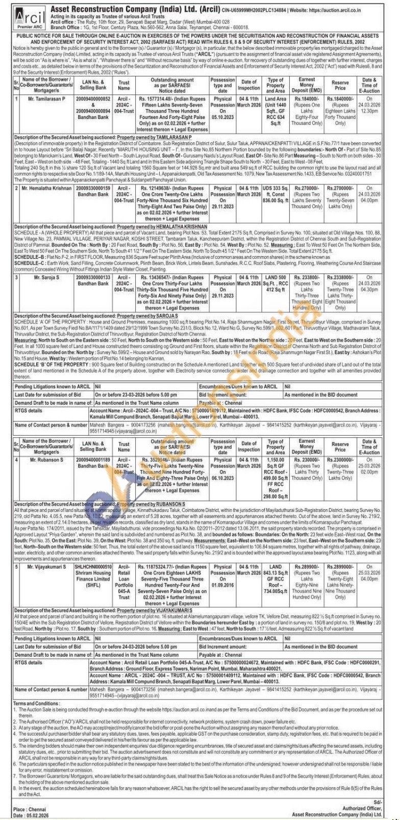 5) All that piece and parcel of land and building in the northem portion of plot no. 16 situated at Alamelumangapuram village vellore TK, Vellore Dist, measuring 822 % Sq.ft comprised in Survey no. 150/4E within the Sub Registration District of Vellore, Registration District of Vellore within the Boundaries hereunder East by: a portion of land in survey no. 150/8 and plot no, 19, West by: 20 feet Road, North by: Plotno 17, South by: Southem portion of Platno. 16. Measuring: East to West: 47 feet, North to South: 17% feet Admeasuring 822 V Sq ft of vacant land