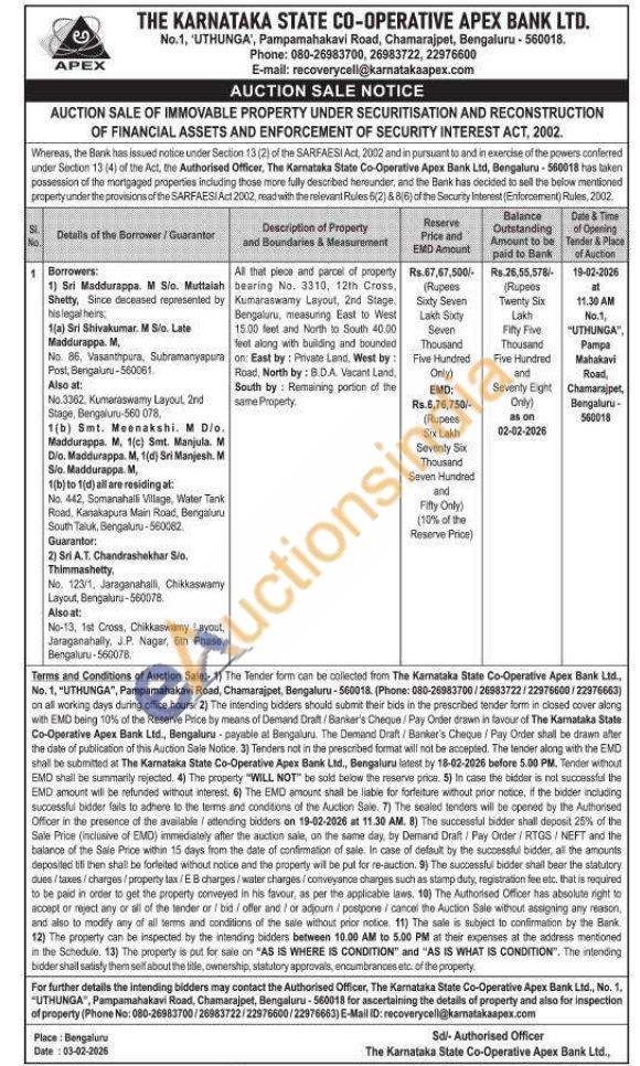 All that piece and parcel of property bearing No. 3310, 12th Cross, Kumaraswamy Layout, 2nd Stage. Bengaluru, measuring East to West 15.00 feet and North to South 40.00 feet along with building and bounded on: East by: Private Land, West by: Road, North by: B.D.A. Vacant Land, South by Remaining portion of the same Property