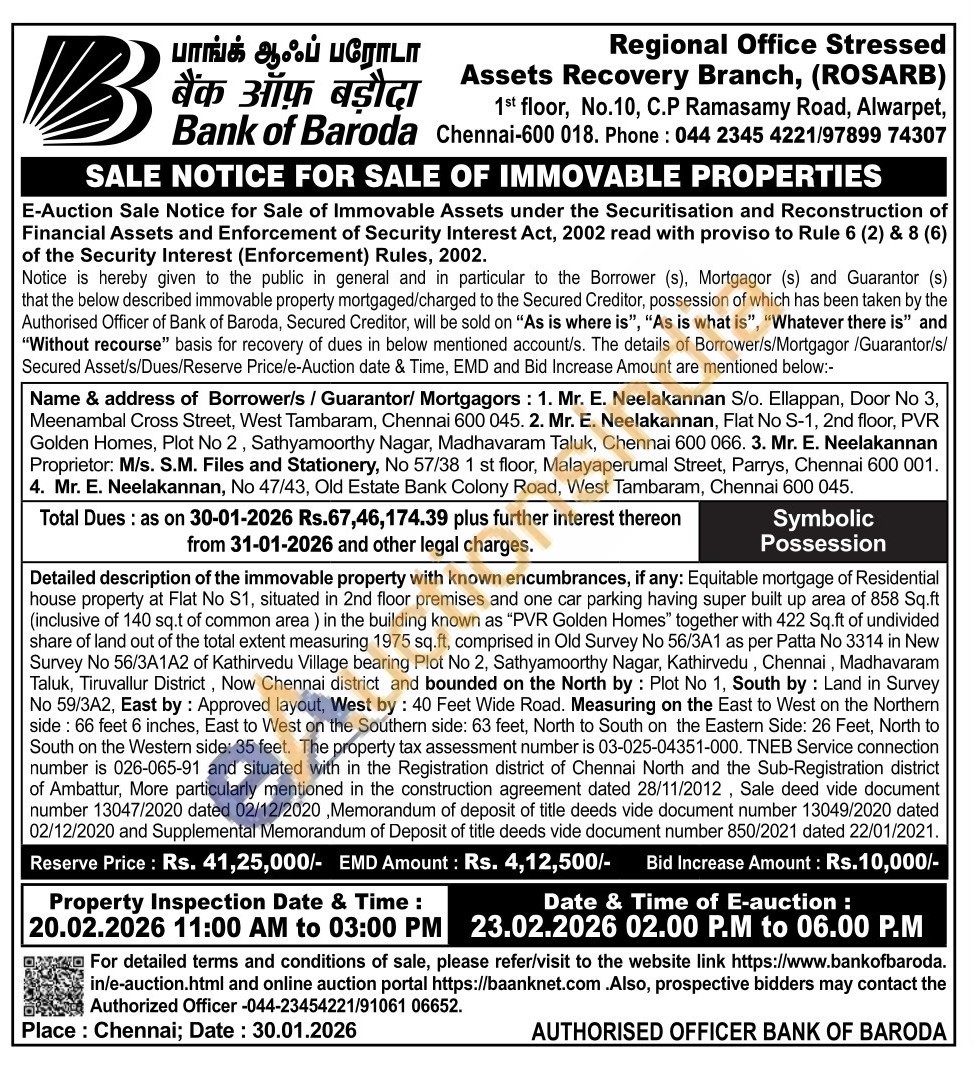 Detailed description of the immovable property with known encumbrances, if any: Equitable mortgage of Residential house property at Flat No S1, situated in 2nd floor premises and one car parking having super built up area of 858 Sq.ft (inclusive of 140 sq.t of common area) in the building known as "PVR Golden Homes" together with 422 Sq.ft of undivided share of land out of the total extent measuring 1975 sq.ft, comprised in Old Survey No 56/3A1 as per Patta No 3314 in New Survey No 56/3A1A2 of Kathirvedu Village bearing Plot No 2, Sathyamoorthy Nagar, Kathirvedu, Chennai, Madhavaram Taluk, Tiruvallur District, Now Chennai district and bounded on the North by: Plot No 1, South by: Land in Survey No 59/3A2, East by: Approved layout, West by: 40 Feet Wide Road. Measuring on the East to West on the Northern side: 66 feet 6 inches, East to West on the Southern side: 63 feet, North to South on the Eastern Side: 26 Feet, North to South on the Western side: 35 feet. The property tax assessment number is 03-025-04351-000. TNEB Service connection number is 026-065-91 and situated with in the Registration district of Chennai North and the Sub-Registration district of Ambattur, More particularly mentioned in the construction agreement dated 28/11/2012, Sale deed vide document number 13047/2020 dated 02/12/2020, Memorandum of deposit of title deeds vide document number 13049/2020 dated 02/12/2020 and Supplemental Memorandum of Deposit of title deeds vide document number 850/2021 dated 22/01/2021