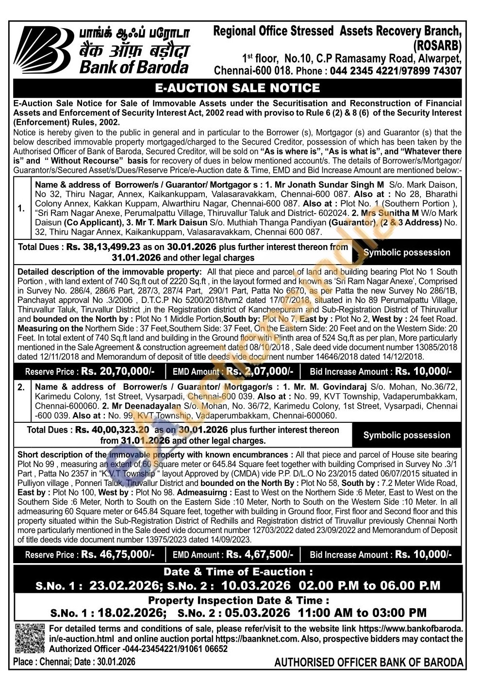 Detailed description of the immovable property: All that piece and parcel of land and building bearing Plot No 1 South Portion, with land extent of 740 Sq.ft out of 2220 Sq.ft, in the layout formed and known as 'Sri Ram Nagar Anexe', Comprised in Survey No. 286/4, 286/6 Part, 287/3, 287/4 Part, 290/1 Part, Patta No 6670, as per Patta the new Survey No 286/1B, Panchayat approval No 3/2006, D.T.C.P No 5200/2018/tvm2 dated 17/07/2018, situated in No 89 Perumalpattu Village, Thiruvallur Taluk, Tiruvallur District, in the Registration district of Kancheepuram and Sub-Registration District of Thiruvallur and bounded on the North by: Plot No 1 Middle Portion, South by: Plot No 7, East by: Plot No 2, West by: 24 feet Road. Measuring on the Northern Side: 37 Feet, Southern Side: 37 Feet, On the Eastern Side: 20 Feet and on the Western Side: 20 Feet. In total extent of 740 Sq.ft land and building in the Ground floor with Plinth area of 524 Sq.ft as per plan, More particularly mentioned in the Sale Agreement & construction agreement dated 08/10/2018, Sale deed vide document number 13085/2018 dated 12/11/2018 and Memorandum of deposit of title deeds vide document number 14646/2018 dated 14/12/2018