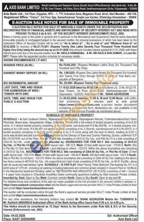 SCHEDULE-A East Godavari District. Rajanagaram Sib-Registry, Rajanagaram Mandal, Chakradwarabandham Gram Panchyat, Board ania. Velugubanda Village, Z-Meraka, R.S.No.050 a full extent of landed property consisting of Ac.6.25 cents, in & central landed properly consisting of Ac.0.80 cents, sub-divisioned R.S.No.650148, in it landed property con sisting of Ac: 0.80 cents, R.S.No 651 init landed property consating of Ac.23icents, sub-devisioned as R.S.No 651/5, init landed property consisting of Ac 2.39 cents totalling to Ac.3.19 cents along with the land of others, totalling Ac. 9.09 14 cents was divided and laid out house plots approved by the Director of Town and Country Planning, Guntur, confirmed TLP No.151/2016/R out of the Plots, Plot No. 14 is a alte consisting of 2415.53 Sq. Yds, and Plot No. 15 is a site consisting of 2264.40 Sq. Yds, under two items and bounded by: BOUNDARIES FOR ITEM NO.1: Site consisting of 2415.53 Sq. Yds., in Plot No.14 East: 33 feel width layout road-186 10 ft. West: 33 feet width layout road 175.60 ft. North: Site in Plot No.15 (2nd Item) 120.0 ft South: Land belongs to others-120.0 it. Within the above boundaries site consisting of 2415.53 Sq. Yds... BOUNDARIES FOR ITEM NO.2: Site consisting of 2264.40 Sq. Yds, in Plot No.15 East: 33 feet width layout road-169.10 ft. West: 33 feet width layout road-169.50 ft. North: 400 feet width layout road-1200 ft South: Sille in Plot No.14 (1st item)-1200 Within the above boundaries site consisting of 2264.40 Sq. Yds totaling to the above two items comes to 4679.93 Sq. Yds, init unspecified joint right of site consisting of 58.50 Sq. Yds or 48.91 5q.Mts, along with all usual and easmentary nights. SCHEDULE-B FOR FLAT: West Facing Three Bedroom Flat bearing No. 101 in a plinth area of 1375 aft., including car parking (including balconies and common areas) situated in Ground Floor in 1st Blook in the Residental Apartment Building called as "NETRAVATHI AND ARKAVATHI (80 FLATS) consisting of stit Ground +4 upper fools situated in Chandrika Avanthika Gated community apartment building by Raki Avenues Private Limited, bounded by: East: Open to Sky West: Common corridor North: Open to Sky South: Open to sky and lift