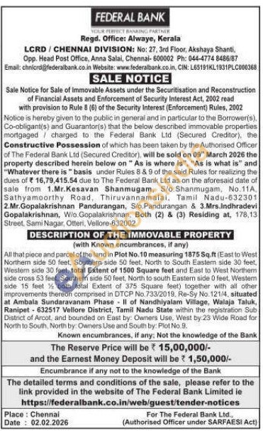 All that piece and parcel of the land in Plot No. 10 measuring 1875 Sq.ft (East to West Northem side 50 feet, Southern side 50 feet, North to South Eastem side 30 feet, Western side 30 feet, total Extent of 1500 Square feet and East to West Northem side cross 53 feet, Southern side 50 feet, North to south Eastern side 0 feet, Western side 15 feet % both total Extent of 375 Square feet) together with all other improvements thereon comprised in DTCP No. 733/2019. Re-Sy No. 121/4, situated at Ambala Sundaravanam Phase II of Nandhiyalam Village, Walaja Taluk, Ranipet 632517 Vellore District, Tamil Nadu State within the registration Sub District of Arcot, and bounded on East by: Owners Use, West by:23 Wide Road for North to South, North by: Owners Lise and South by: Plot No.B.