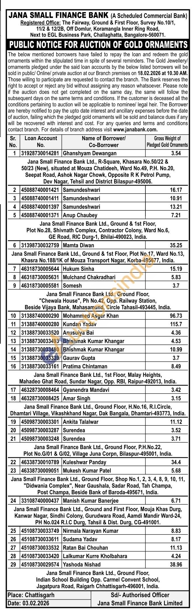 Jana Small Finance Bank Gold Auctions Auction in Bengaluru