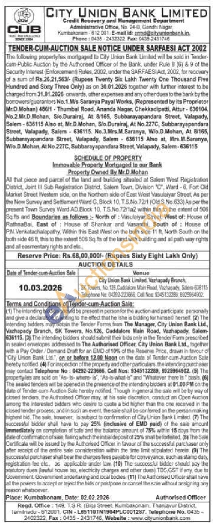 All that piece and parcel of the land and building situated at Salern West Registration District, Joint III Sub Registration District, Salem Town, Division "C", Ward-6, Fort Old Afarket Street Western side, on the Northem side of East West Vasulaiyar Street, As per the New Survey and Settlement Ward G. Block 10, T.S.No. 72/1 (Old S.No.633) As per the present Town Survey Ward AD Block 10, TS.No. 72/102 within this to the extent of 506 Sqfts and Boundaries as follows: North of Vimulaiyar Street, West of: House of RathnaBai, East of House of Shankar and Vasanthi, South of House of P.N. Venkatachalapathy, Within this East West on the both side 11 ft. North South on the both side 46 ft, this to the extent 506 Sq fits of the land with building and all path way rights and all easmentary rights and etc.