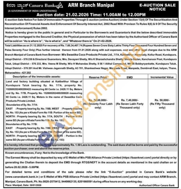 Land and factory building situated at Kattbelthur Village of Kundapura Taluk bearing Sy. No. 7/7A, property No. 152600202400200422 measuring 60 Cents ie. 2428.11 Sq. Meters and Sy. No. 7/7B, Property No. 152600202400200828 measuring 60 Cents ie. 2428.11 Sq. Meters in the name of Swastika Coco Products Private Limited. Boundaries of Sy. No. 7/7A: EAST Property bearing Sy. No. 7/88, WEST: Property bearing Sy. No. 153 (As per e Khata Form No 118: Portion of the same SD). NORTH: Property bearing Sy. No. 7/7A, SOUTH Portion in the same SD (As per e Khata Form No 11B: Sy. No. 153) Boundaries of Sy. No. 7/7B: EAST: Property bearing Sy. No. 7/8B, WEST: Property bearing Sy. No. 153 (As per e Khata Form No 118: Portion of the same SD). NORTH: Property bearing Sy. No. 7/7A, SOUTH: Portion in the same SD (As per e Khata Form No 11B: Sy. No. 153