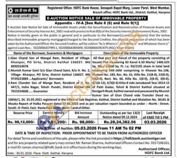 All that part and Parcel of the property consisting of Vacant Plot measuring 02 Kanal 6.50 Marla/1406.625 5q. Yds./12660 Sq. Ft. i.e. 93/2192 share in total land measuring 54K-16M comprising in Khewat No.108, Khatoni No. 183, Rec. No. 61, Killa No. 21(8-0), 22(8-0), 23(8-0), Rect. No. 66, Killa No. 1(8-0), 2(8-0), 3(8-0), 4/1(6-12), 4/3(0-4) Kitta 8 vide Jamabandi Year 2014-15 of Patti Gadar, Tehsil & District Kaithal situated at Devigarh Road, Kaithal owned and possessed by Munish Kumar Son of Gian Chand vide Transfer Deed no.10656/1, Dt. 25.03.2021 registered in the office of Sub Registrar, Kaithal, District Kaithal and Mutation No. 36181 & Mauka Report of Halka Patwari dated 07.01.2022 and as per valuation report bounded as under: -North: Street. South: 0-Point. East: Rasta then Drain. West: Land of Other.
