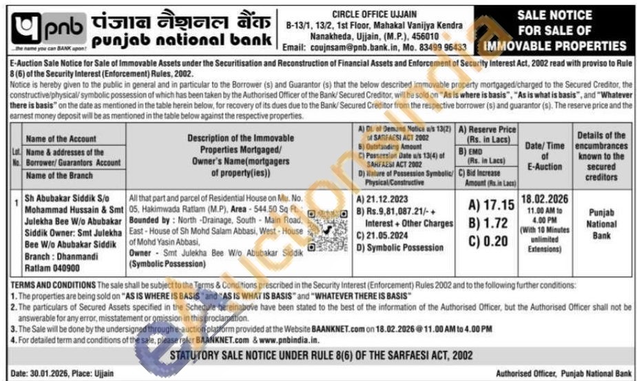 All that part and parcel of Residential House on Mu. No. 05, Hakimwada Ratlam (M.P), Area-544.50 Sq Ft.:Bounded by: North-Drainage, South Main Road, East House of Sh Mohd Salam Abbasi, West-House of Mohd Yasin Abbasi,Owner Smt Julekha Bee W/o Abubakar Siddik (Symbolic Possession