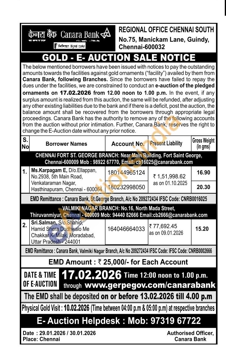 Canara Bank Gold Auctions Auction in Chennai