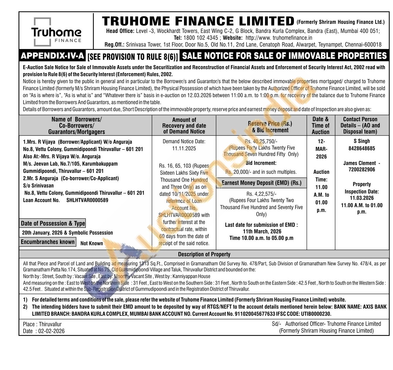 All that Piece and Parcel of Land and Building ad measuring 1313 Sq.Ft., Comprised in Gramanatham Old Survey No. 478/Part, Sub Division of Gramanatham New Survey No. 478/4, as per Gramanatham Patta No. 174, Situated at No.75, Old Gummidipoondi Village and Taluk, Thiruvallur District and bounded on the: North by: Street, South by: Vacant Site, East by: Moorthy Vacant Site, West by: Kanniyappan House And measuring on the: East to West on the Northern Side: 31 Feet, East to West on the Southern Side: 31 Feet, North to South on the Eastern Side: 42.5 Feet, North to South on the Western Side: 42.5 Feet. Situated at within the Sub-Registration District of Gummudipoondi and in the Registration District of Thiruvallur.