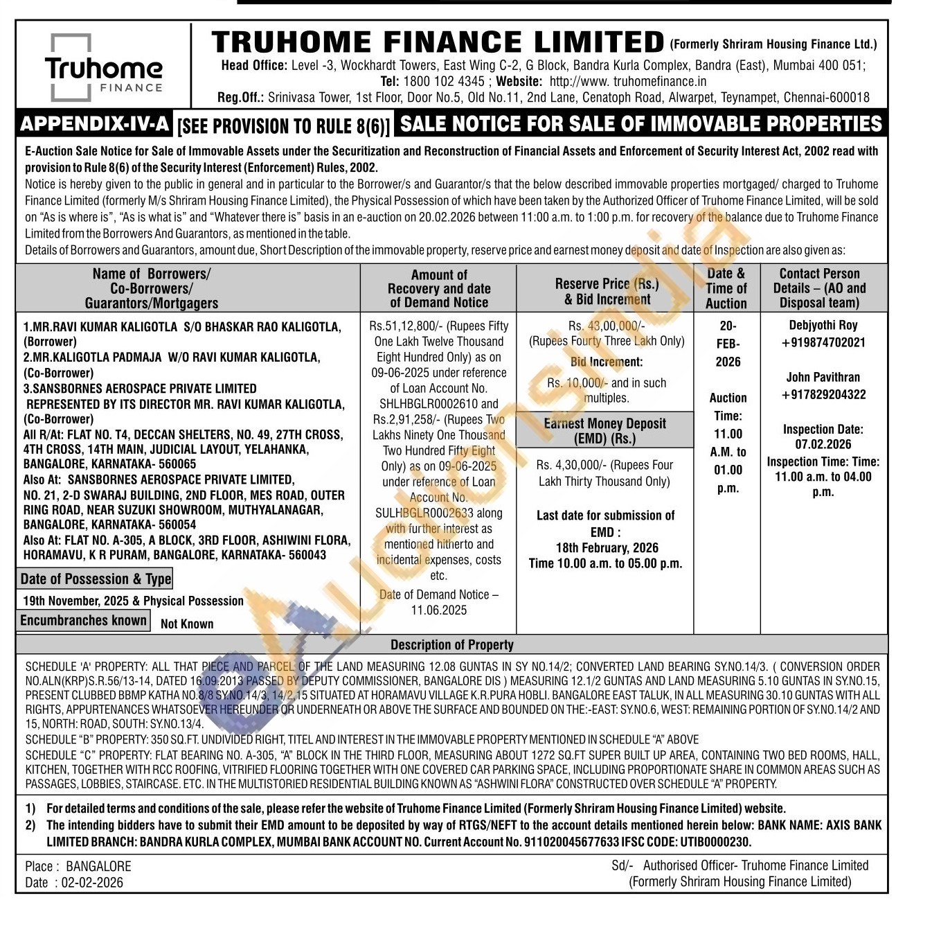 SCHEDULE 'A' PROPERTY: ALL THAT PIECE AND PARCEL OF THE LAND MEASURING 12.08 GUNTAS IN SY NO.14/2; CONVERTED LAND BEARING SY.NO.14/3. (CONVERSION ORDER NO.ALN(KRP)S.R.56/13-14, DATED 16.09.2013 PASSED BY DEPUTY COMMISSIONER, BANGALORE DIS) MEASURING 12.1/2 GUNTAS AND LAND MEASURING 5.10 GUNTAS IN SY.NO.15, PRESENT CLUBBED BBMP KATHA NO.8/8 SY.NO.14/3, 14/2, 15 SITUATED AT HORAMAVU VILLAGE K.R.PURA HOBLI. BANGALORE EAST TALUK, IN ALL MEASURING 30.10 GUNTAS WITH ALL RIGHTS, APPURTENANCES WHATSOEVER HEREUNDER OR UNDERNEATH OR ABOVE THE SURFACE AND BOUNDED ON THE:-EAST: SY.NO.6, WEST: REMAINING PORTION OF SY.NO.14/2 AND 15. NORTH: ROAD, SOUTH: SY.NO.13/4. SCHEDULE "B" PROPERTY: 350 SQ.FT. UNDIVIDED RIGHT, TITEL AND INTEREST IN THE IMMOVABLE PROPERTY MENTIONED IN SCHEDULE "A" ABOVE SCHEDULE "C" PROPERTY: FLAT BEARING NO. A-305, "A" BLOCK IN THE THIRD FLOOR, MEASURING ABOUT 1272 SQ.FT SUPER BUILT UP AREA, CONTAINING TWO BED ROOMS, HALL, KITCHEN, TOGETHER WITH RCC ROOFING, VITRIFIED FLOORING TOGETHER WITH ONE COVERED CAR PARKING SPACE, INCLUDING PROPORTIONATE SHARE IN COMMON AREAS SUCH AS PASSAGES, LOBBIES, STAIRCASE. ETC. IN THE MULTISTORIED RESIDENTIAL BUILDING KNOWN AS "ASHWINI FLORA" CONSTRUCTED OVER SCHEDULE "A" PROPERTY.
