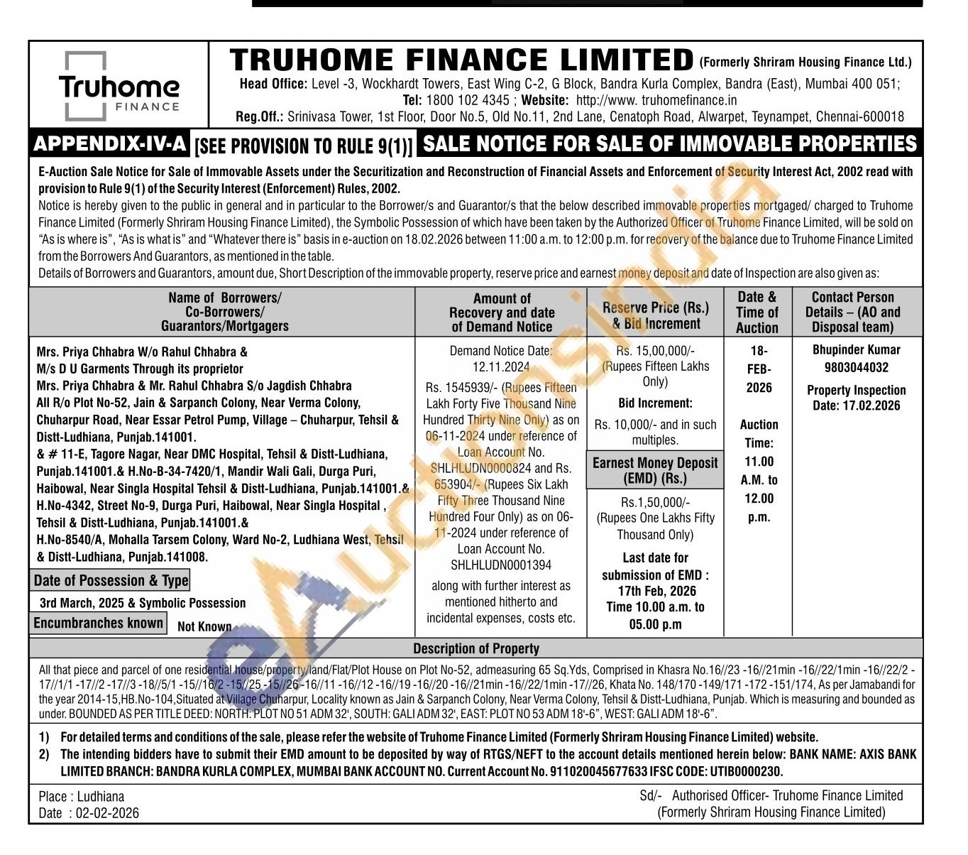 All that piece and parcel of one residential house/property/land/Flat/Plot House on Plot No-52, admeasuring 65 Sq. Yds, Comprised in Khasra No.16//23-16//21min-16//22/1min -16//22/2-17//1/1-17//2-17//3-18//5/1-15//16/2-15//25-15//26-16//11-16//12-16//19-16//20-16//21min-16//22/1min-17//26, Khata No. 148/170-149/171-172-151/174, As per Jamabandi for the year 2014-15,HB.No-104, Situated at Village Chuharpur, Locality known as Jain & Sarpanch Colony, Near Verma Colony, Tehsil & Distt-Ludhiana, Punjab. Which is measuring and bounded as under. BOUNDED AS PER TITLE DEED: NORTH: PLOT NO 51 ADM 32', SOUTH: GALI ADM 32, EAST: PLOT NO 53 ADM 18-6", WEST: GALI ADM 18'-6"