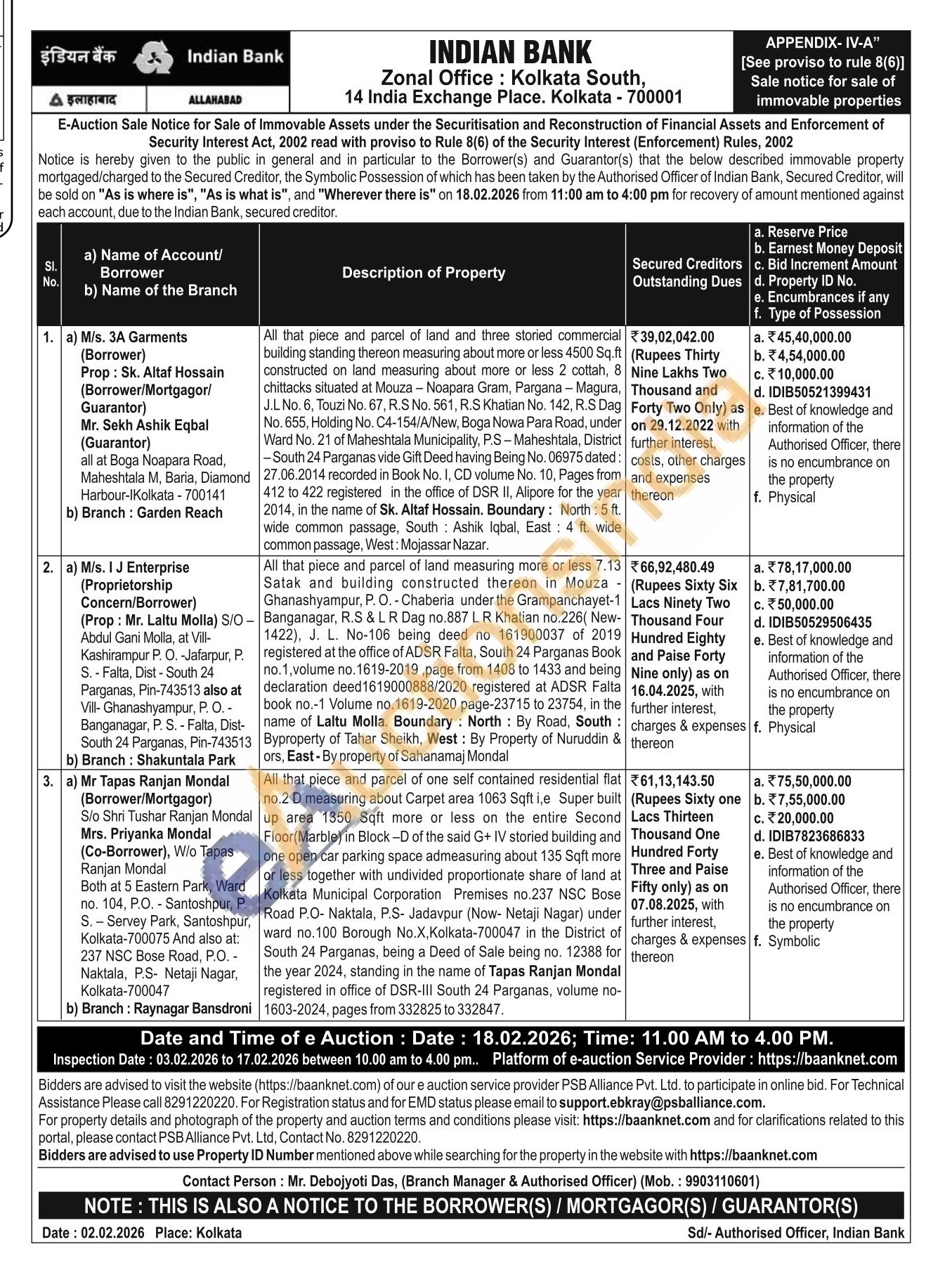 Mr. Debojyoti Das, (Branch Manager & Authorised Officer) (Mob.: 9903110601)