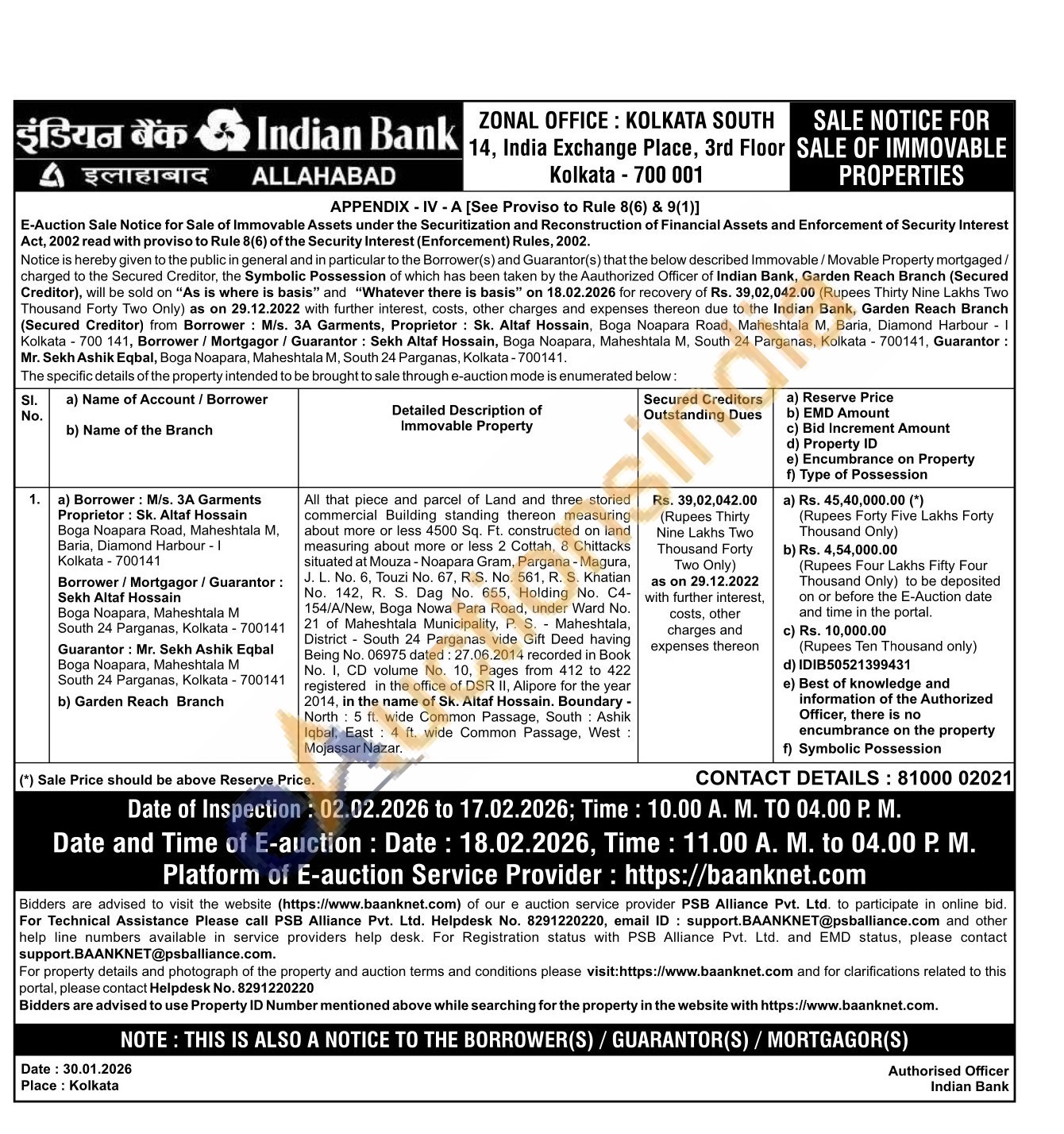 All that piece and parcel of Land and three storied commercial Building standing thereon measuring about more or less 4500 Sq. Ft. constructed on land measuring about more or less 2 Cottah, 8 Chittacks situated at Mouza - Noapara Gram, Pargana-Magura, J. L. No. 6, Touzi No. 67, R.S. No. 561, R. S. Khatian No. 142, R. S. Dag No. 655, Holding No. C4-154/A/New, Boga Nowa Para Road, under Ward No. 21 of Maheshtala Municipality, P. S. Maheshtala, District South 24 Parganas vide Gift Deed having Being No. 06975 dated: 27.06.2014 recorded in Book No. I, CD volume No. 10, Pages from 412 to 422 registered in the office of DSR II, Alipore for the year 2014, in the name of Sk. Altaf Hossain. Boundary -North 5 ft. wide Common Passage, South: Ashik Iqbal, East 4 ft. wide Common Passage, West: Mojassar Nazar