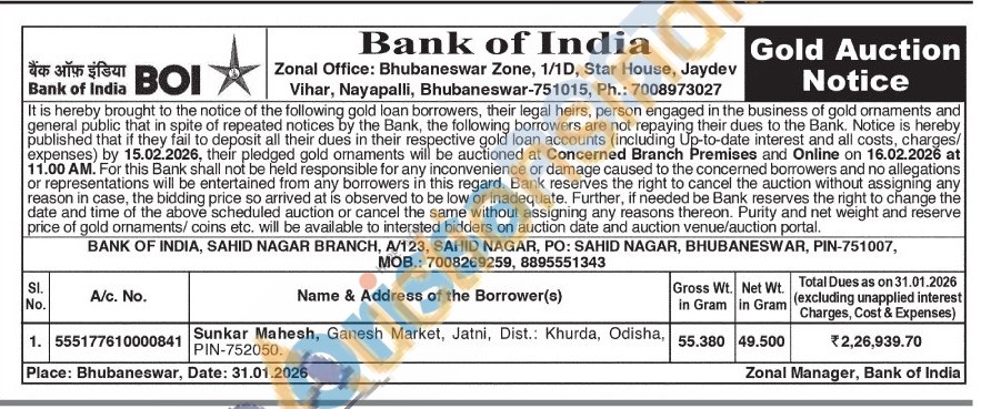 Bank of India Gold Auctions Auction in Bhubaneswar