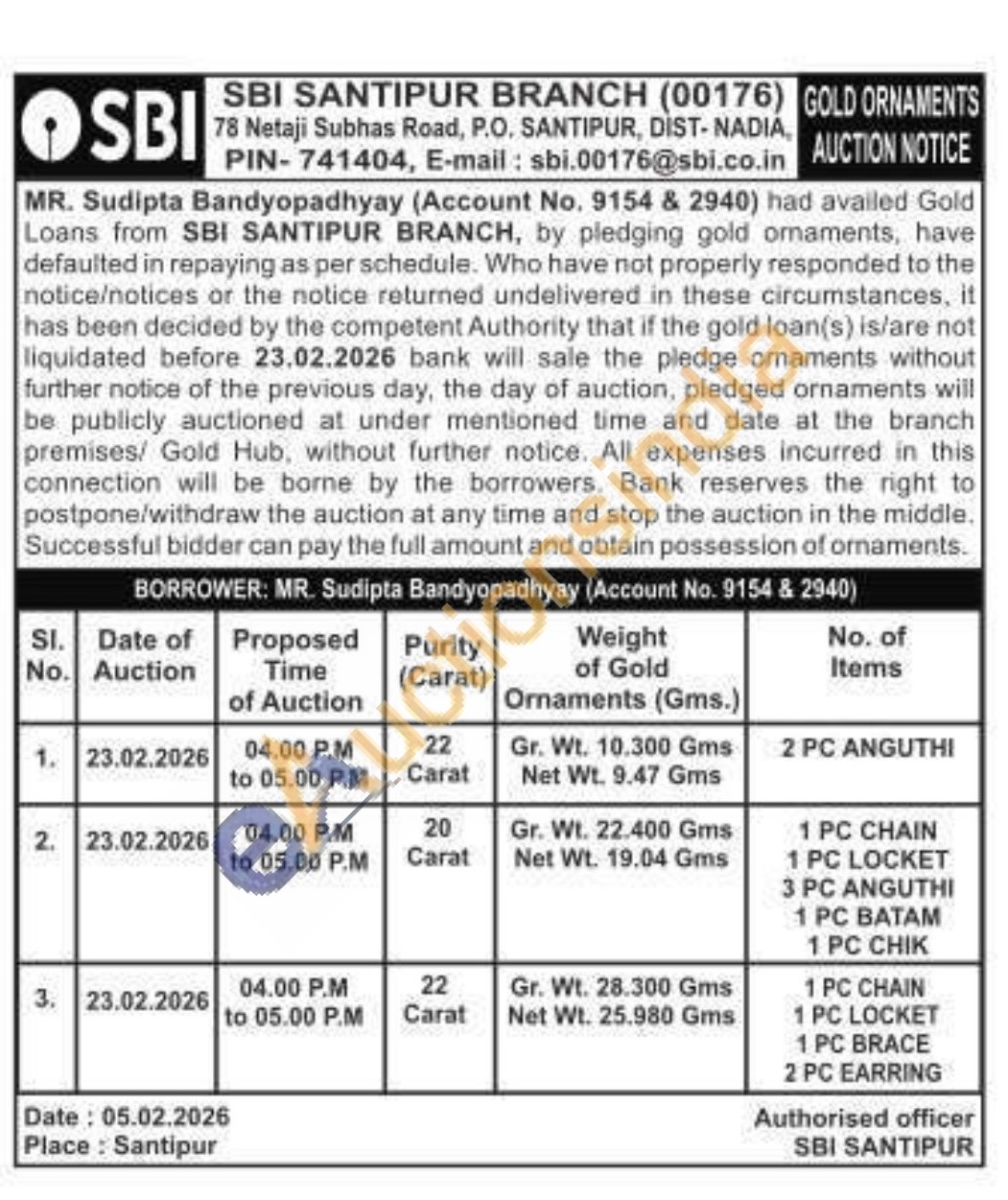 State Bank of India Gold Auctions Auction in Nadia