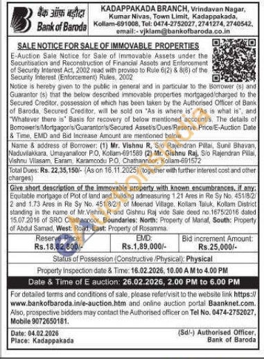 Equitabile mortgage of Plot of land and building admeasuring 1.21 Ares in Re Sy No. 451/8/2/2 and 1.73 Ares in Re Sy No. 451/8/2/1 of Meenad Village, Kolam Taluk, Kollam District standing in the name of Mr.Vishnu R and Gishnu Raj vide Sale deed no.1675/2016 dated 15.07.2016 of SRO Chathanncor. Boundaries: North: Property of Manaf, South: Property of Abdul Samad, West: Road, East: Property of Rosamma
