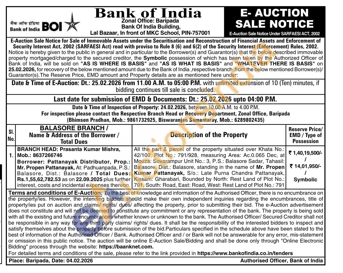 All the part & parcel of the property situated over Khata No.: 42/100, Plot No.: 791/928, measuring Area: Ac.0.065 Dec, at Mouza: Sovarampur Unit No.: 3, P.S.: Balasore Sadar, Tahasil: Balasore, Dist.: Balasore, standing in the name of Mr. Propen Kumar Pattanayak, S/o.: Late Purna Chandra Pattanayak, Kissam: Gharabari, Bounded by North: Rest Land of Plot No.: 791, South: Road, East: Road, West: Rest Land of Plot No.: 791