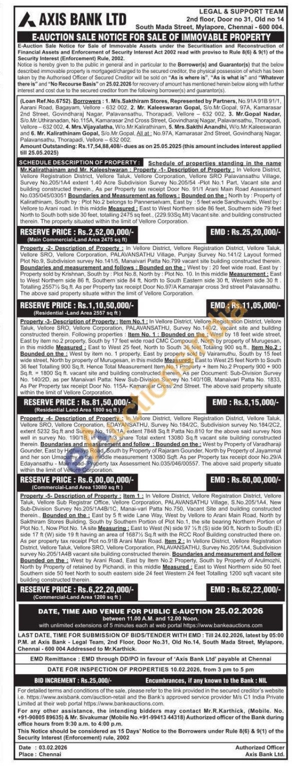 contact Mr. R.Karthick, (Mobile. No. +91-90805 89635) & Mr. Sivakumar (Mobile No. +91-99413 44318) Authorized officer .