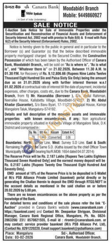Non agricultural immovable property situated in Kalabettu Village of Mangalore Taluk, D.K District and comprised in: Sy. No. SD No. Kissam Extent A-C 79 1443 Converted 0.06 Boundaries: North: Survey Line, West: Survey S.D Line. East & South: Remaining Portion of the Same S.D. (Katha issued by the chief Officer Town Municipality Moodbidri bearing No/R.MDB: 1654 dated 04.07.2014)
