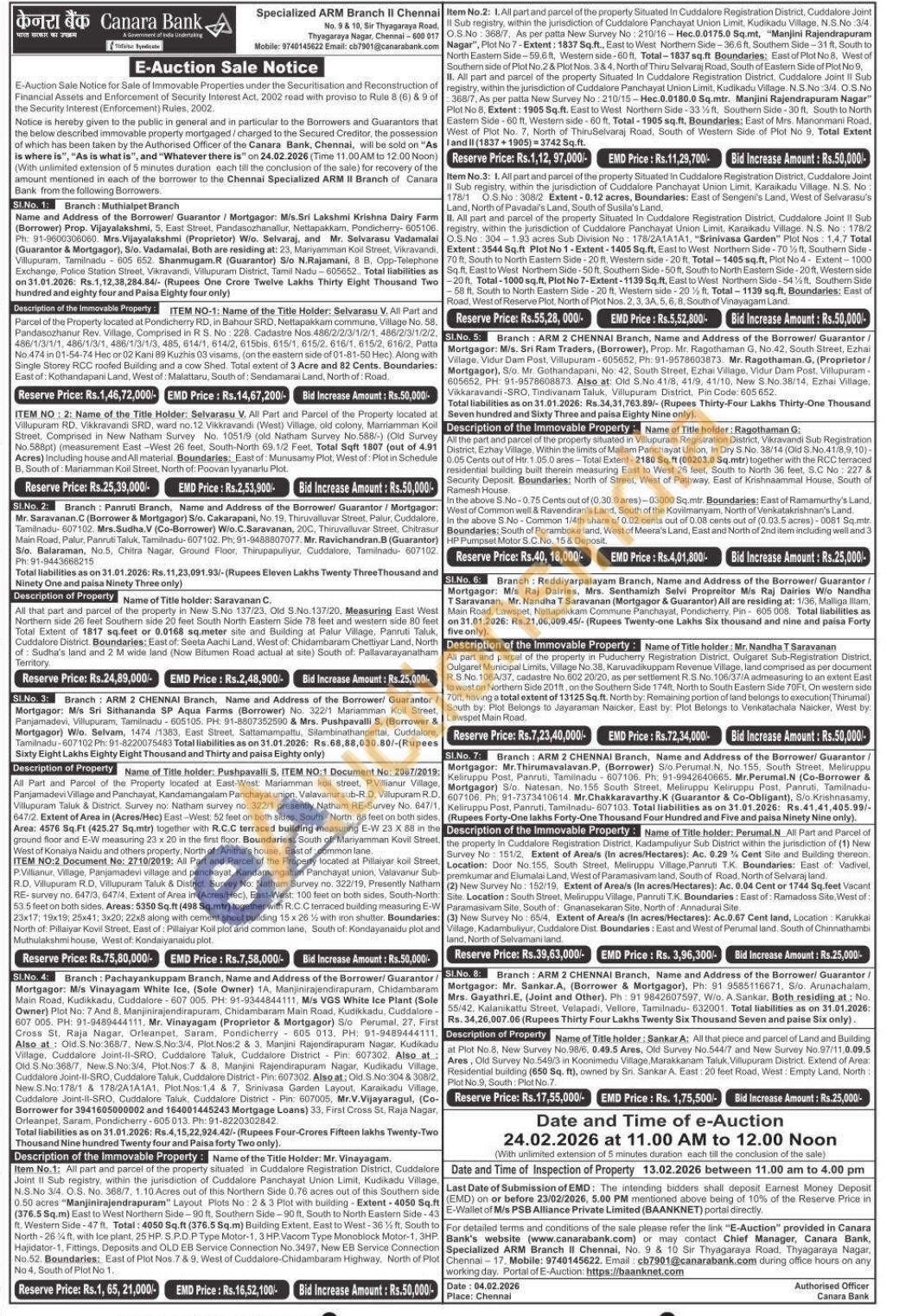 4) Item No.2: 1. All part and parcel of the property Situated in Cuddalore Registration District, Cuddalore Joint Il Sub registry, within the jurisdiction of Cuddalore Panchayat Union Limit, Kudikadu Village, N.S.No 3/4. O.S. No: 368/7, As per patta New Survey No: 210/16-Hec.0.0175.0 Sq.mt, "Manjini Rajendrapuram Nagar", Plot No 7-Extent: 1837 Sq.ft., East to West Northern Side-36.6 ft. Southern Side-31 ft. South to North Eastern Side-59.6ft, Western side-60ft, Total-1837 sq.ft Boundaries: East of Plot No 8, West of Southern side of Plot No.2 & Plot Nos. 38 4, North of Thiru Selvaraj Road, South of Eastern Side of Plot No 9, 11. All part and parcel of the property Situated In Cuddalore Registration District, Cuddalore Joint Il Sub registry, within the jurisdiction of Cuddalore Panchayat Union Limit, Kudikadu Village. N.S.No :3/4. O.S.No 368/7, As per patta New Survey No: 210/15-Hec.0.0180.0 Sq.mtr. Manjini Rajendrapuram Nagar" Plot No 8, Extent: 1905 Sq.ft. East to West Northern Side-33%ft, Southern Side-30 ft. South to North Eastern Side-60 ft, Western side-60 ft, Total 1905 sq.ft. Boundaries: East of Mrs. Manonmani Road, West of Plot No. 7, North of ThiruSelvaraj Road, South of Western Side of Plot No 9. Total Extent I and II (1837-1905)=3742 Sq.ft.
