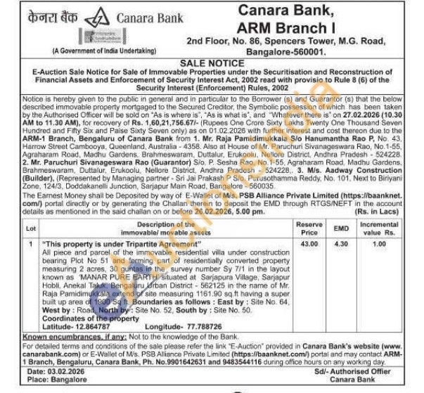 All piece and parcel of the immovable residential villa under construction bearing Plot No 51 and forming part of residentially converted property measuring 2 acres, 30 guntas in the survey number Sy 7/1 in the layout known as MANAR PURE EARTH' situated at Sarjapura Village, Sarjapur Hobli, Anekal Taluk, Bengaluru Urban District-562125 in the name of Mr. Raja Pamidimukkala extend of site measuring 1161.90 sq.ft having a super built up area of 1900 Sq ft. Boundaries as follows: East by: Site No. 64. West by: Road, North by: Site No. 52, South by: Site No. 50.