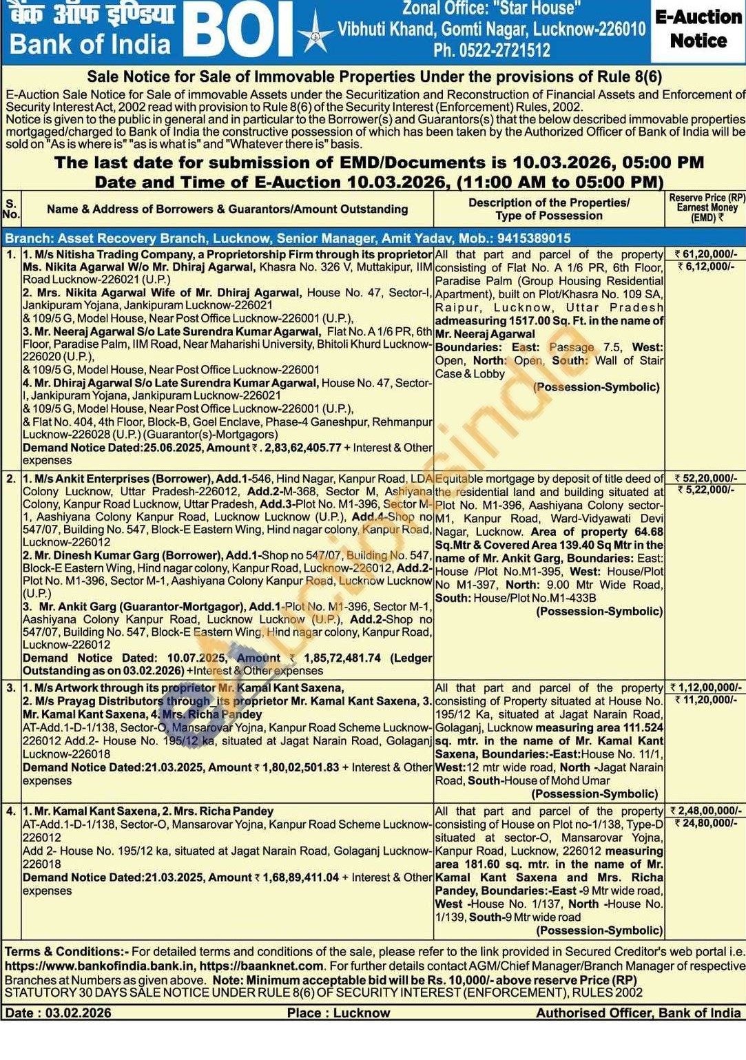 All that part and parcel of the property consisting of Property situated at House No. 195/12 Ka, situated at Jagat Narain Road, -, Lucknow measuring area 111.524 Golaganjisq. mtr. in the name of Mr. Kamal Kant Road, South-House of Mohd Umar Saxena, Boundaries:-East:House No. 11/1, West: 12 mtr wide road, North-Jagat Narain