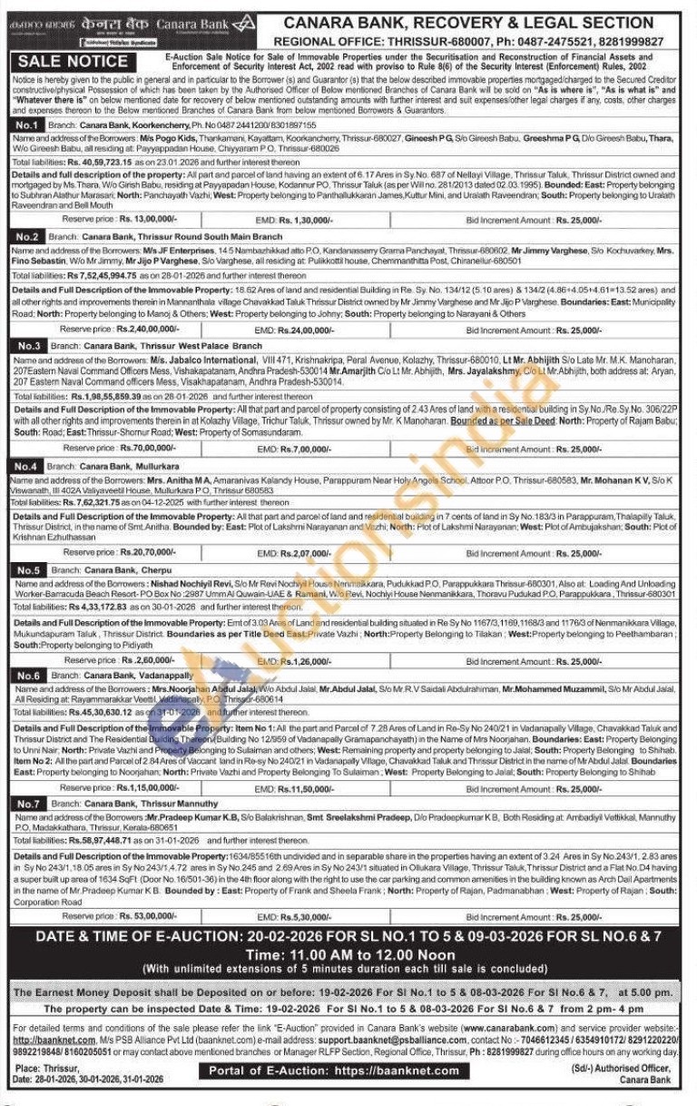6) Item No 1: All the part and Parcel of 7.28 Ares of Land in Re-Sy No 240/21 in Vadanapally Village, Chavakkad Taluk and Thrissur District and The Residential Building Thereon (Building No 12/950 of Vadanapalty Gramapanchayath) in the Name of Mrs Noorjahan. Boundaries: East: Property Belonging to Unni Nair, North: Private Vazhi and Property Belonging to Sulaiman and others; West: Remaining property and property belonging to Jalal, South: Property Belonging to Shihab. Item No 2: All the part and Parcel of 2.84 Ares of Vaccant land in Re-sy No 240/21 in Vadanapally Village, Chavakkad Taluk and Thrissur District in the name of Mr Abdul Jalal Boundaries East: Property belonging to Noorjahan: North: Private Vazhi and Property Belonging To Sulaiman: West: Property Belonging to Jalal, South: Property Belonging to Shihab