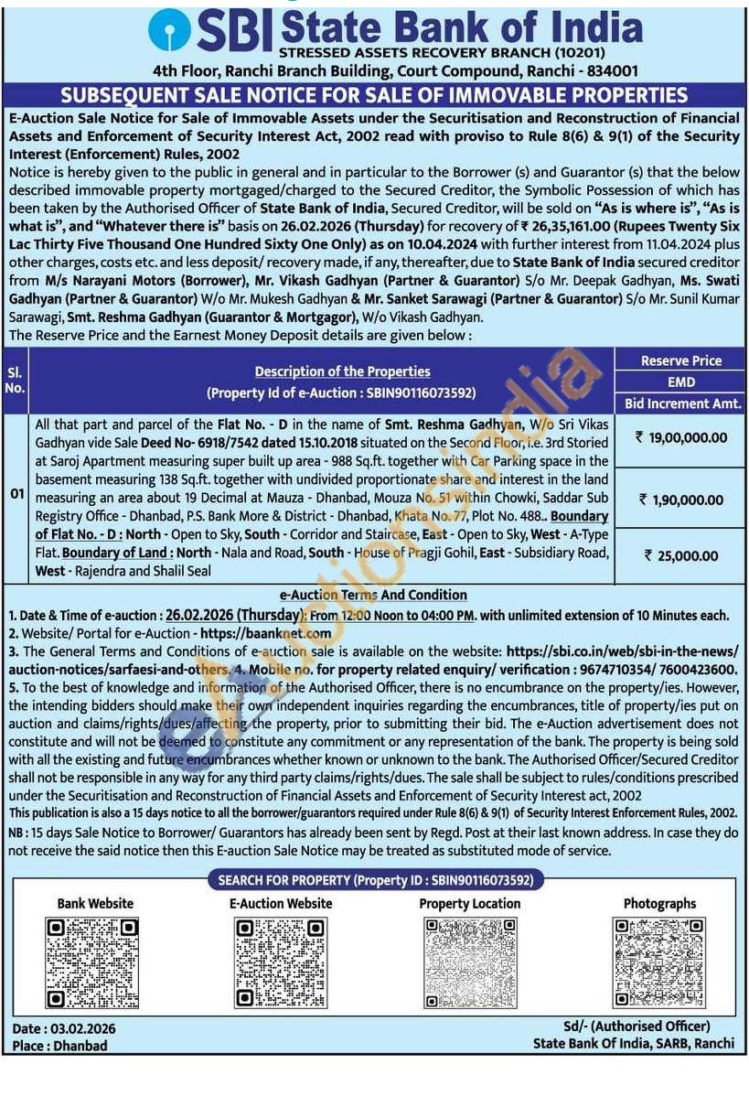 All that part and parcel of the Flat No. D in the name of Smt. Reshma Gadhyan, W/o Sri Vikas Gadhyan vide Sale Deed No-6918/7542 dated 15.10.2018 situated on the Second Floor, i.e. 3rd Storied at Saroj Apartment measuring super built up area - 988 Sq.ft. together with Car Parking space in the basement measuring 138 Sq.ft. together with undivided proportionate share and interest in the land 01 measuring an area about 19 Decimal at Mauza - Dhanbad, Mouza No. 51 within Chowki, Saddar Sub Registry Office - Dhanbad, P.S. Bank More & District - Dhanbad, Khata No. 77, Plot No. 488.. Boundary of Flat No. - D: North - Open to Sky, South - Corridor and Staircase, East - Open to Sky, West - A-Type Flat. Boundary of Land: North - Nala and Road, South - House of Pragji Gohil, East - Subsidiary Road, West - Rajendra and Shalil Seal