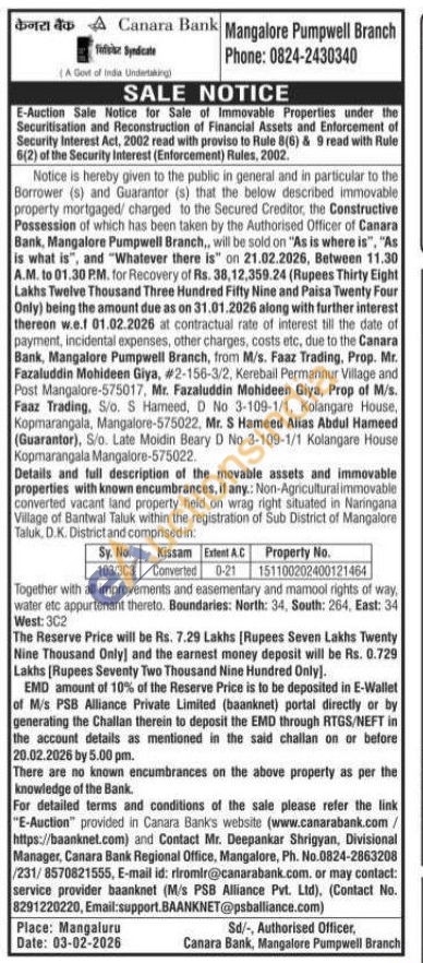 Non-Agricultural immovable converted vacant land property held on wrag right situated in Naringana Village of Bantwal Taluk within the registration of Sub District of Mangalore Taluk. D.K. District and comprised in: Sy. No. Kissam Extent A.C Property No. 103/303 Converted 0-21 151100202400121464 Together with all improvements and easementary and mamool rights of way, water etc appurtenant thereto. Boundaries: North: 34, South: 264, East: 34 West: 302