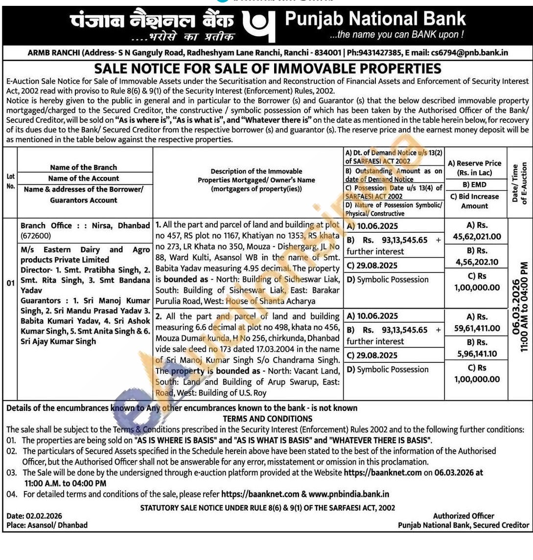 All the part and parcel of land and building measuring 6.6 decimal at plot no 498, khata no 456, Mouza Dumar kunda, H No 256, chirkunda, Dhanbad vide sale deed no 173 dated 17.03.2004 in the name of Sri Manoj Kumar Singh S/o Chandrama Singh. The property is bounded as - North: Vacant Land, South: Land and Building of Arup Swarup, East: Road, West: Building of U.S. Roy