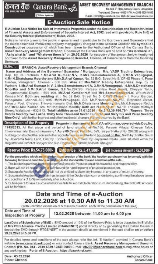 Property in the name of Mr.N.V.Arul Kumaar, covered vide Doc.No. 1745/2013. All that piece and parcel of land situated at No. 166. Parasur Village, Cheyyar Taluk Thiruvannamalai District measuring 1 Acre 69 Cents, Patta No. 529, as per Patta S.No. 297/28 along with building constructed thereon and other appurtenances and the land bounded on the North by: Pattai, South by: Jayarama Naidu Land, East by: Srinivasan Land, West by: Jayarama Naidu Land, situated within the Registration District of Cheyyar and Sub-Registration District of Joint I Cheyyar