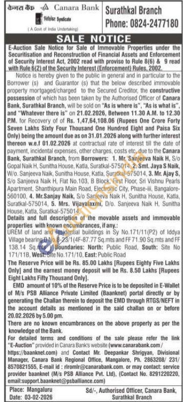 Mr. Deepankar Shrigyan, :0824-2863208/231/8570821555, E-mail id: rlromir@canarabank.com