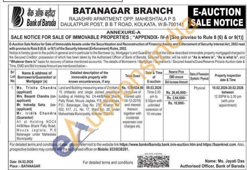 Landand Building measuring area of 2 cottahs, 15 chittacks and single storied residential building at Holding No. C4-44/B/New Shanti Pally Road, Mouza Jagtala, P.S. Maheshtala, PO Batanagar, Dag No. 270, Khatian No. 502, 517, J.L. No. 17, Ward No. 28, under Maheshtala Municipality, Kolkata-700140