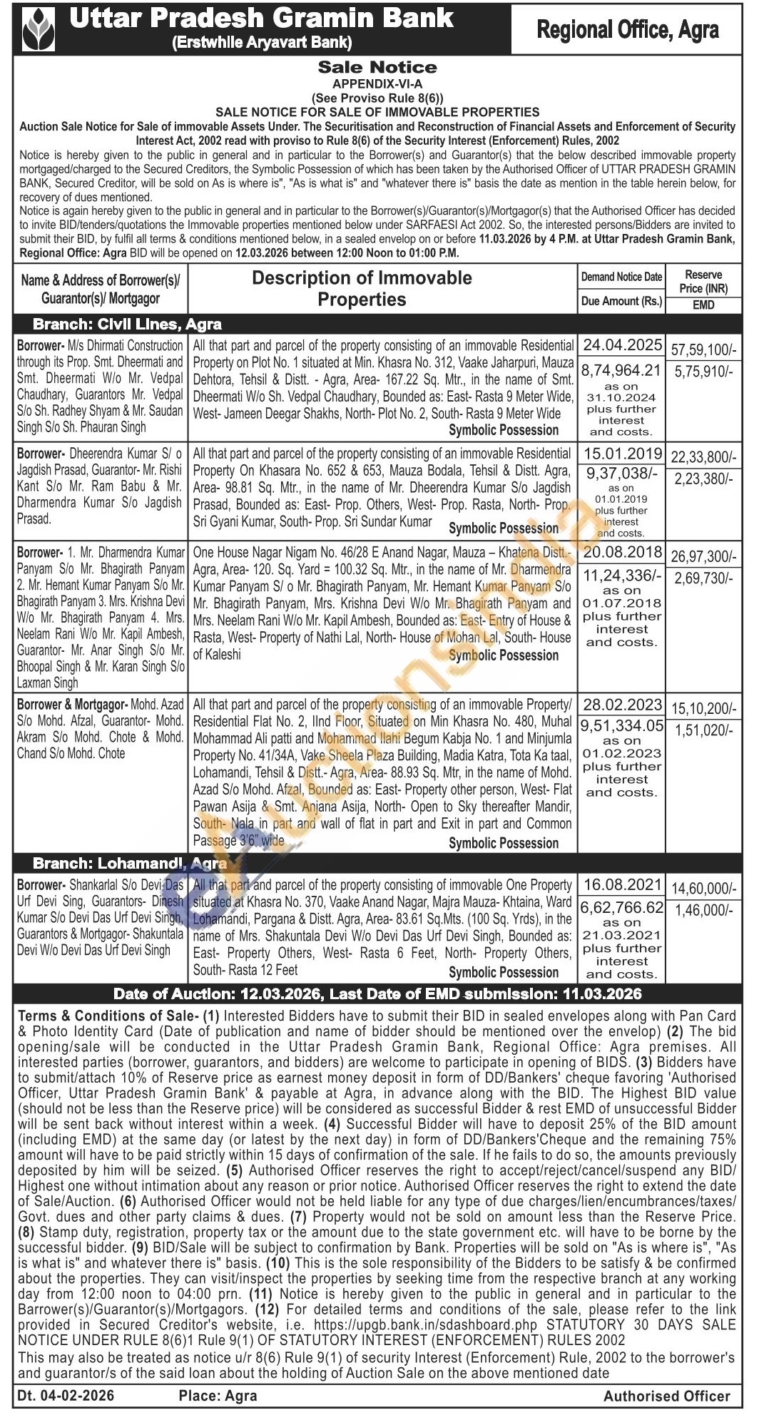 All that part and parcel of the property consisting of an immovable Residential Property on Plot No. 1 situated at Min. Khasra No. 312, Vaake Jaharpuri, Mauza Dehtora, Tehsil & Distt. Agra, Area- 167.22 Sq. Mtr., in the name of Smt. Dheermati W/o Sh. Vedpal Chaudhary, Bounded as: East- Rasta 9 Meter Wide, West- Jameen Deegar Shakhs, North- Plot No. 2, South- Rasta 9 Meter Wide