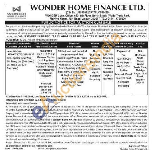 All that part and parcel of the property of Smt. Babita Devi Wio Sh. Rang Lal situated at Plot No. 27, Khasra No. 176, Gram & Gram Panchayat Bagar, Near Govt. School Tehsil & Distt. Jhunjhunu, Rajasthan-333023 Admeasuring about 1800.00 Sq. Feet