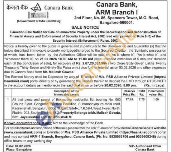 All that piece and parcel of the exiting residential flat bearing No. 003 Ground Floor, Gangothri Pavithra Paradise, Subramanyapura main road, Kadirenahalli, Bengaluru-560070. East: Site No. 7,6,584, West: Foyer, North: Flat No. 002, South: Site No. 182. Property Belongs to Mr. Mallesh Gowda, Smt. Jayalakshmi and Mr. Abhishek M