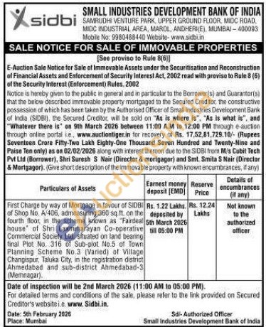 First Charge by way of Mortgage in favour of SIDBI of Shop No. A/406, admeasuring 360 sq.ft. on the fourth floor, in the scheme known as Fairdeal house of Shri Laxminarayan Co-operative Commercial Society Ltd. situated on land bearning tinal Plot No. 316 of Sub-plot No.5 of Town Planning Scheme No.3 (Varied) of Village Changispur, Taluka City, in the registration district Ahmedabad and sub-district Ahmedabad-3 (Memnagar)
