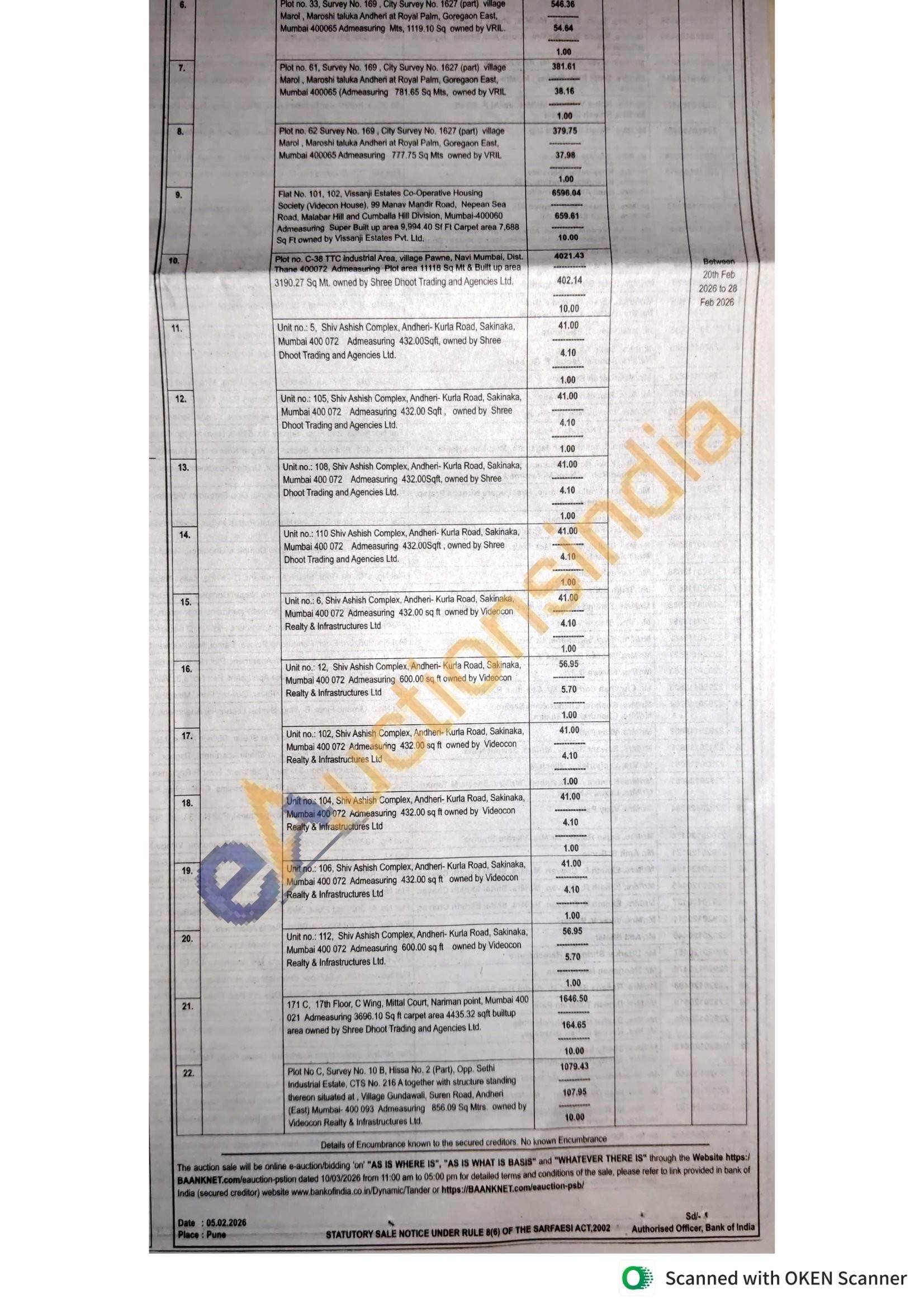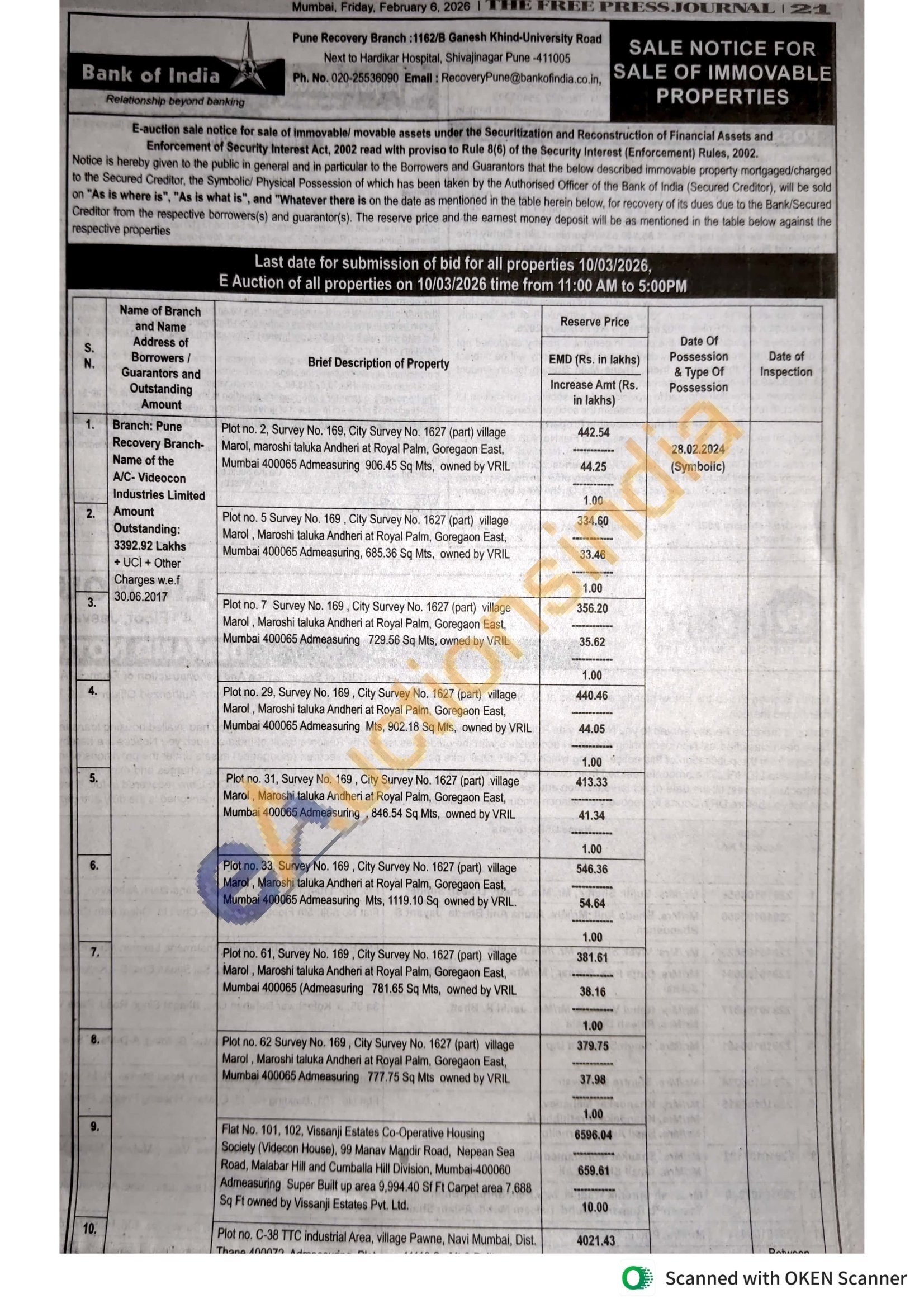 Plot no. 29, Survey No. 169, City Survey No. 1627 (part) village Marol, Maroshi taluka Andheri at Royal Palm, Goregaon East, Mumbai 400065 Admeasuring Mts, 902.18 Sq Mts, owned by VRIL