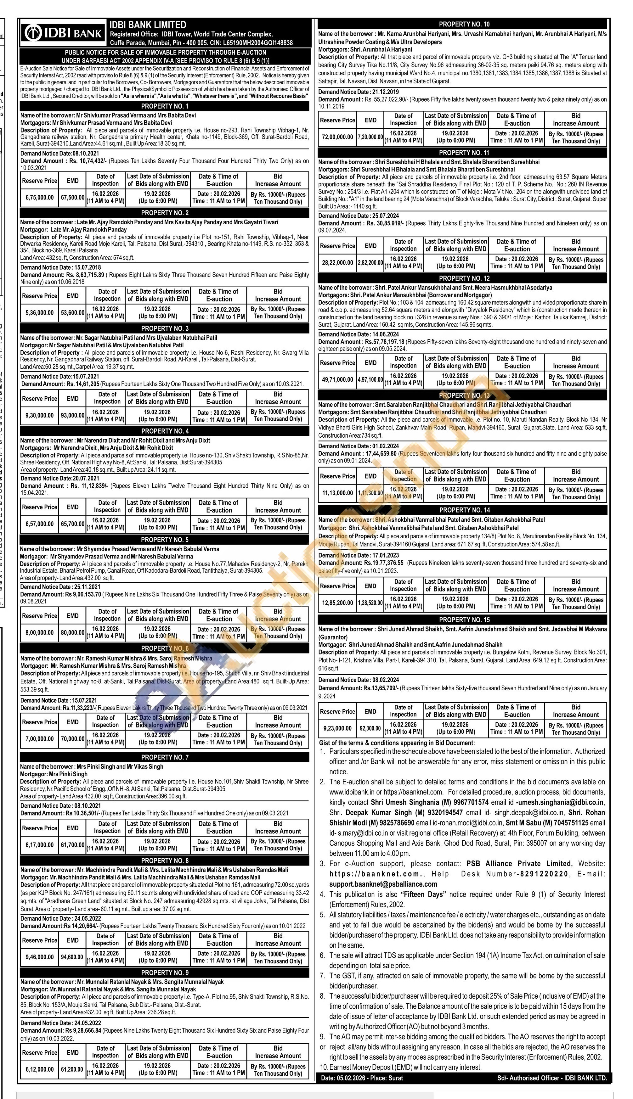 Description of Property: All that piece and parcel of immovable property situated at Plot no. 161, admeasuring 72.00 sq.yards (as per KJP Block No. 247/161) admeasuring 60.11 sq.mts along with undivided share of road and COP admeasuring 33.42 sq.mts. of "Aradhana Green Land" situated at Block No. 247 admeasuring 42928 sq.mts. at village Jolva, Tal. Palsana, Dist Surat. Area of property-Land area-60.11 sq.mt., Built up area: 37.02 sq.mt.