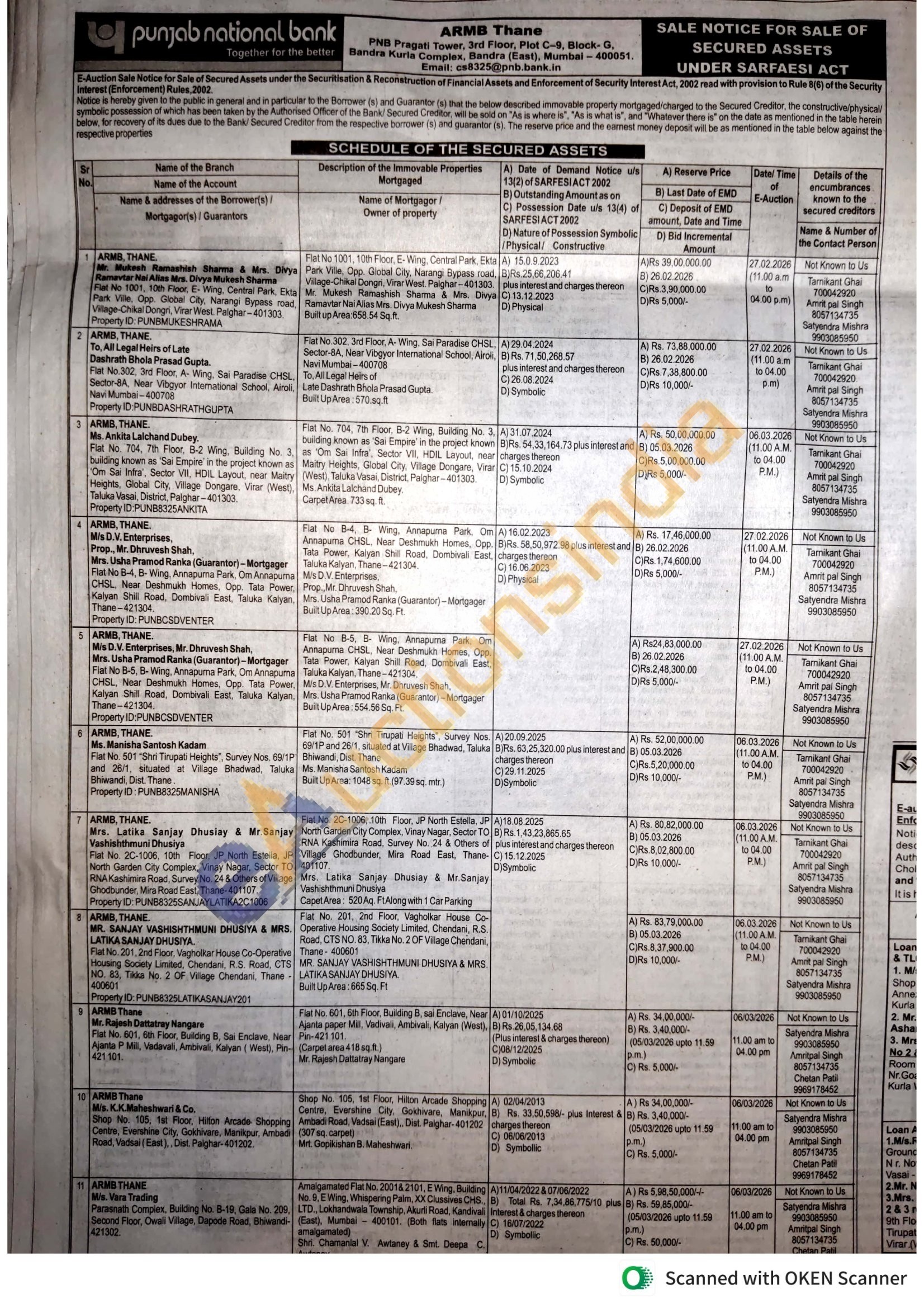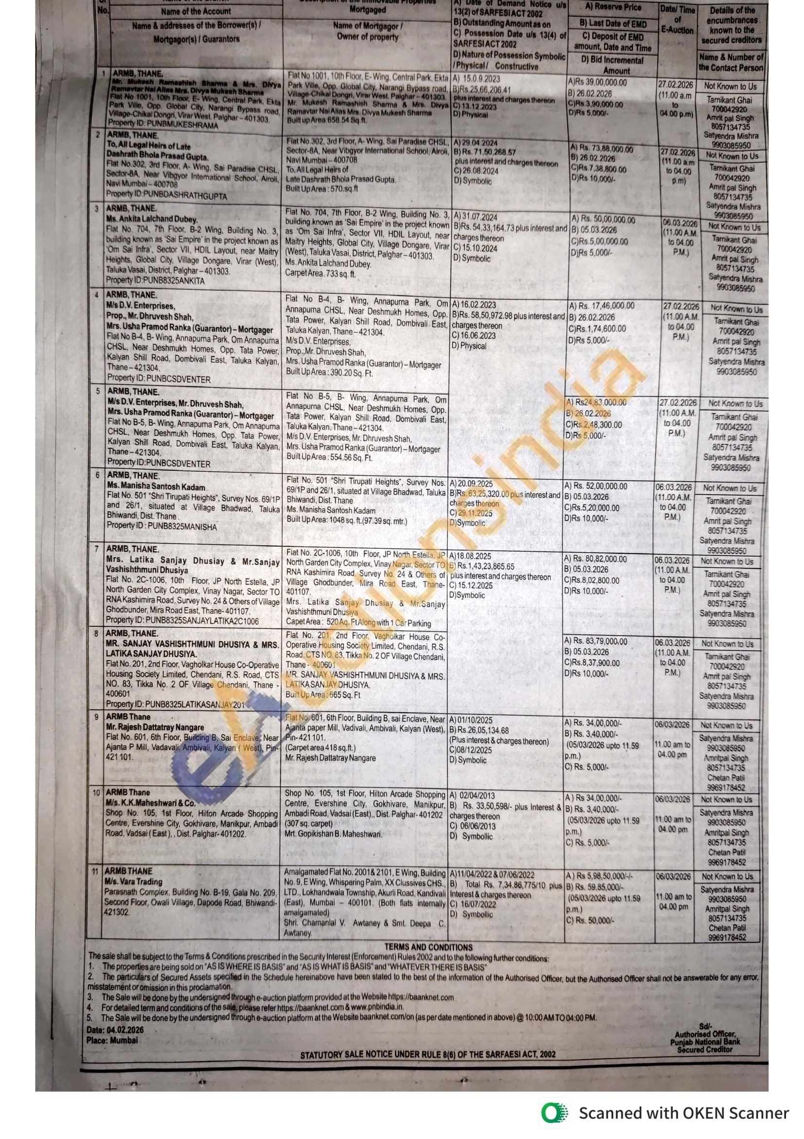 Flat No 1001, 10th Floor, E-Wing, Central Park, Ekta Park Ville, Opp. Global City, Narangi Bypass road, Mr. Mukesh Ramashish Sharma & Mrs. Divya Village-Chikal Dongri, Virar West Palghar-401303. Ramavtar Nai Alias Mrs. Divya Mukesh Sharma Built up Area:658.54 Sq.ft.